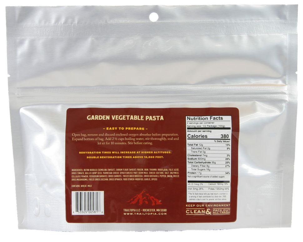 Ingredients: ROTINI NOODLES (SEMOLINA (WHEAT), DURUM FLOUR (WHEAT), NIACIN, IRON, THIAMIN, RIBOFLAVIN, FOLIC ACID), DRIED TOMATO, HULLED HEMP SEED, PARMESAN CHEESE ((PASTEURIZED PART-SKIM MILK, CHEESE CULTURE, SALT, ENZYMES), CELLULOSE POWDER, POTASSIUM SORBATE), DRIED CARROTS, FREEZE DRIED BROCCOLI, DRIED GREEN BELL PEPPER, ONION, FREEZE DRIED MUSHROOMS, FREEZE DRIED ZUCCHINI, DRIED SPINACH, FOOD STARCH-MODIFIED, GARLIC, SPICES