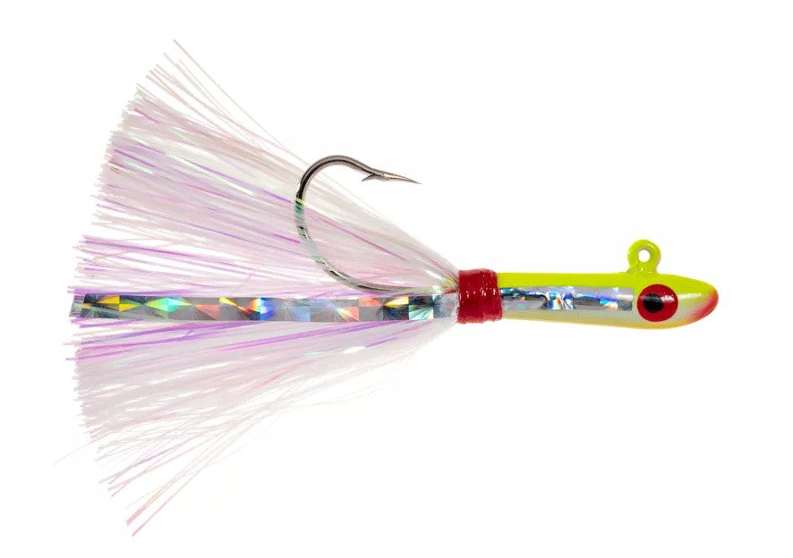If you're an inshore or nearshore game fish, and you see a Tsunami Glass Minnow Jig, you whack it. That's just the way it is. This beautifully crafted jig has a sleek, flashy head design and a tough glow mylar dressing; with its perfect center of balance, it offers a realistic baitfish profile and action that saltwater predators can't resist. Great for straight jigging in any depth, but equally effective on a teaser rig. Sturdy black-nickel round bend hook with extended shank provides maximum hookup rates.