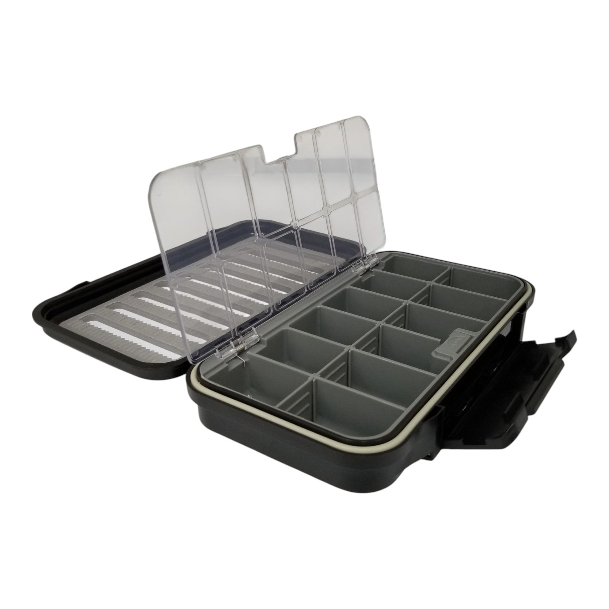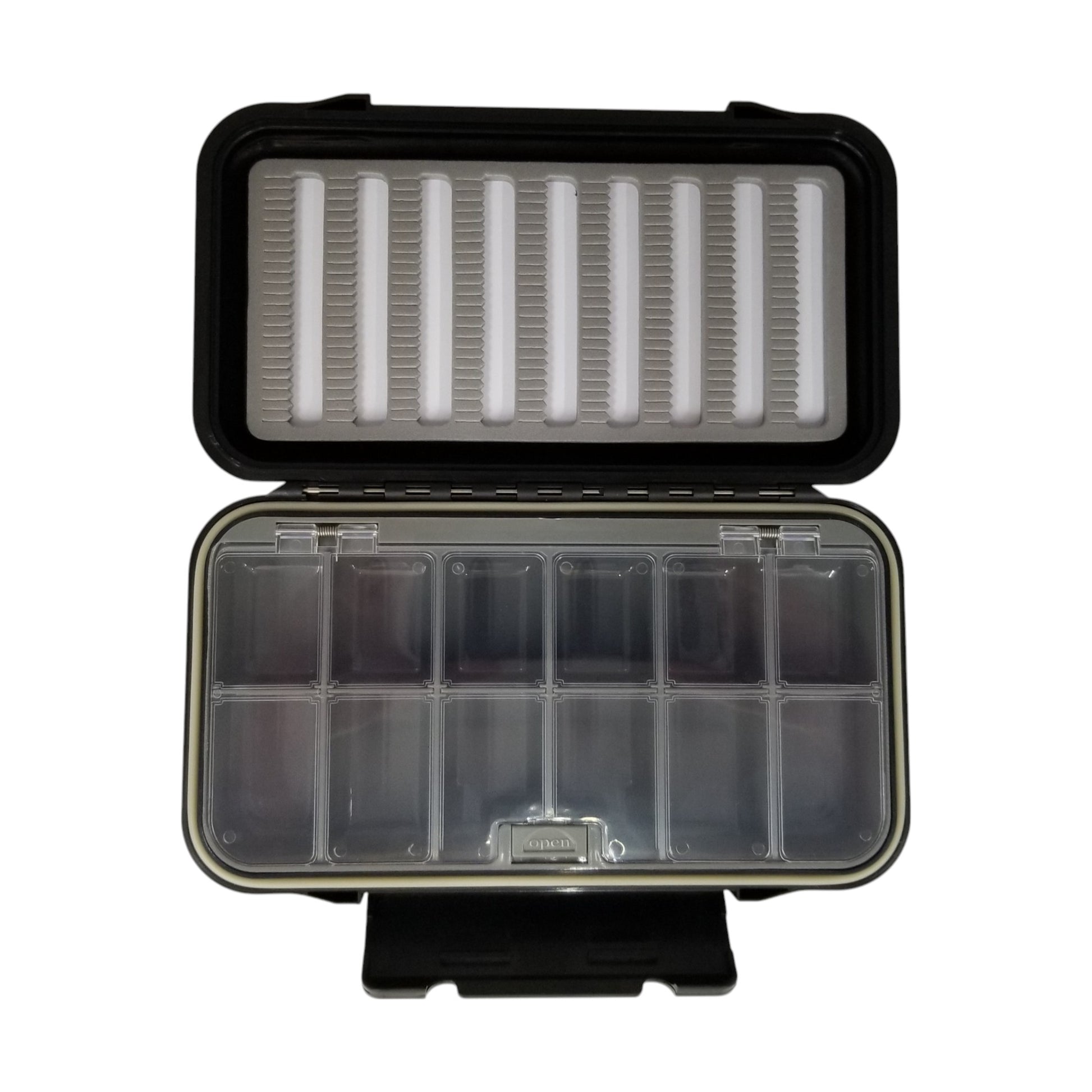 The New Phase Go-To Compartment & Fly Box is made from the same water tight shell as our 1209/1211 go to boxes. This box features 12 compartments with a single see through lid for bead organization. The compartments have rounded corners for easier bead handling. ABS construction with a rubber gasket. This box features our Ramsey Outdoor fish logo in the middle.