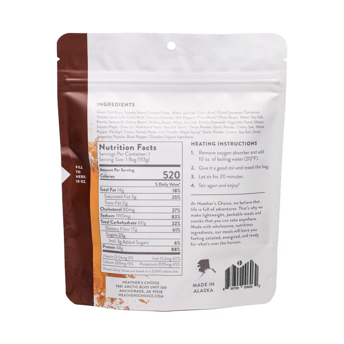 At first, it's hard to believe you're eating such hearty chunks of grass-fed bison, but soon, you'll settle into the warm embrace of our tomato-based chili. It's loaded with fiber, protein, and nutrients delivered by kidney and pinto beans, bell peppers, jalapeños, and just enough chili powder for a friendly kick.