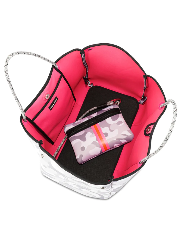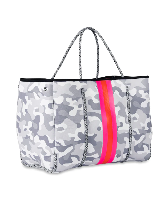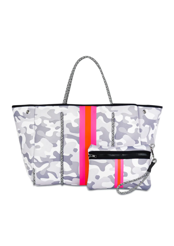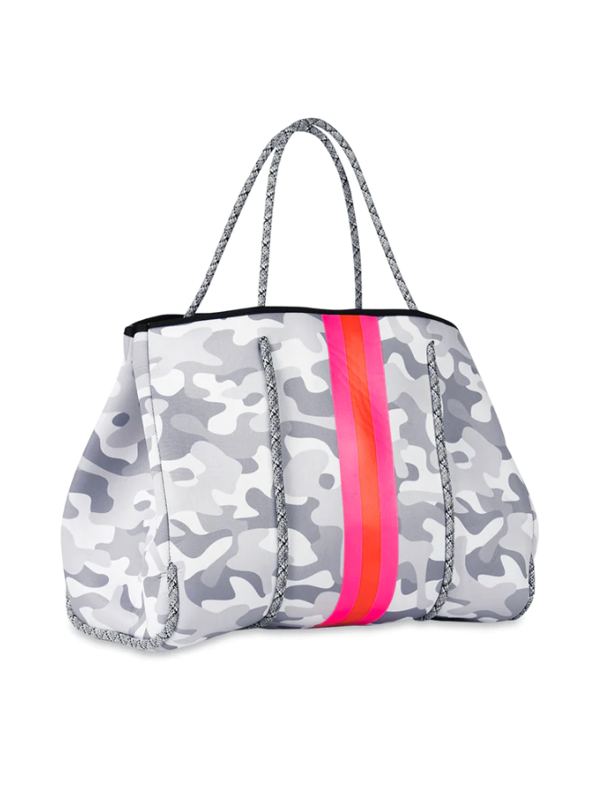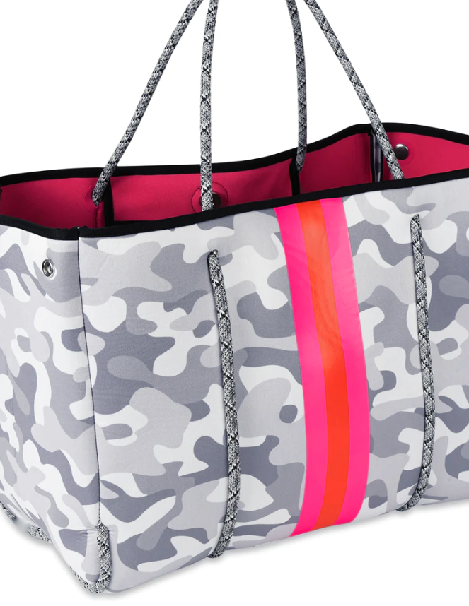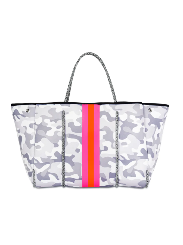 White Camo/Pink/Orange/Pink Stripe. This neoprene tote is the perfect blend of style and functionality.