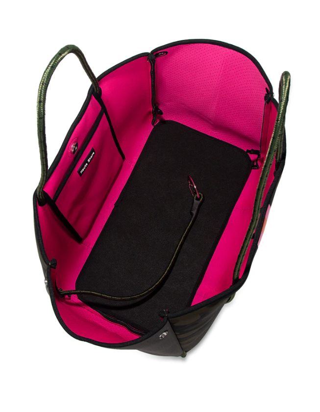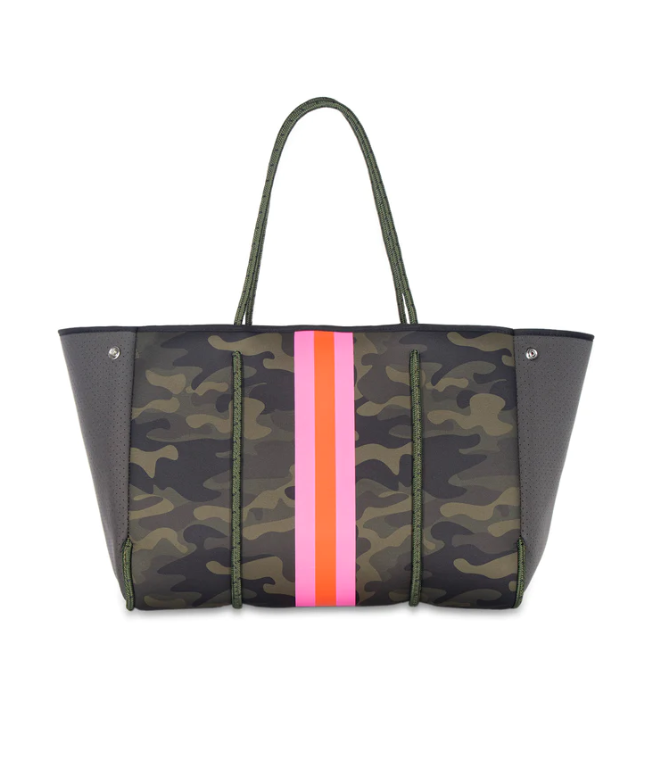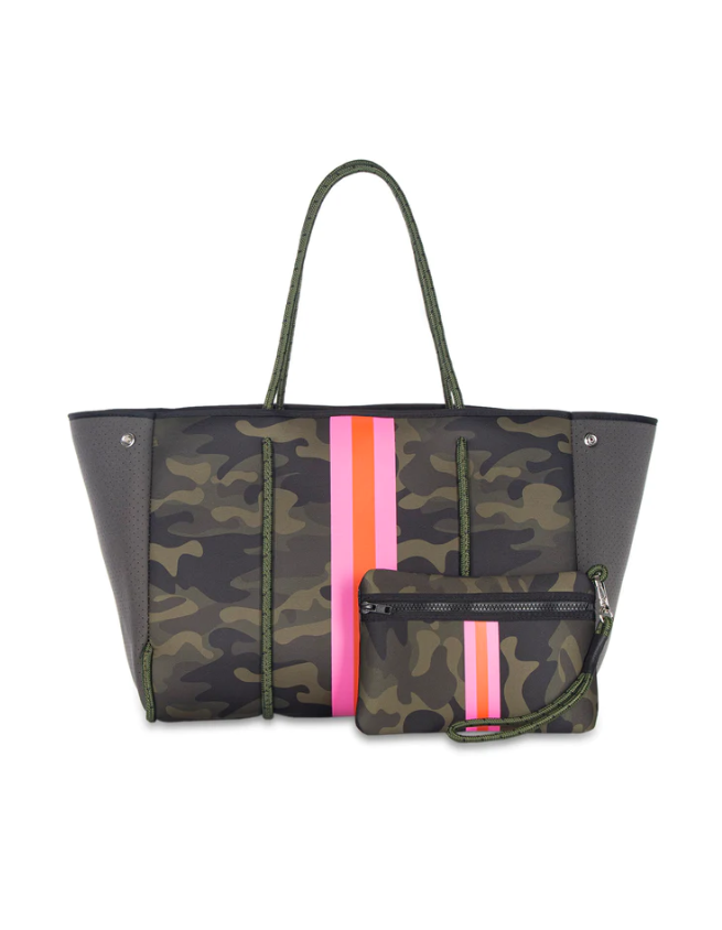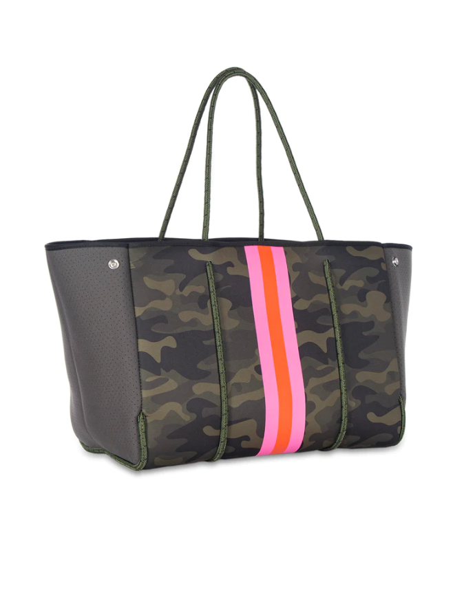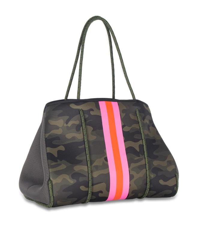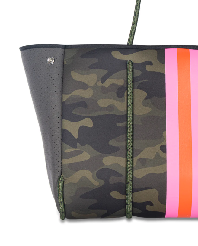 Green Camo/pink and orange stripe. This neoprene tote is the perfect blend of style and functionality.