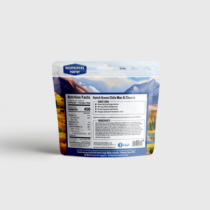 A southwestern spin on a crowd favorite, this freeze-dried outdoor meal is bursting with our custom Belgian elbow pasta, spicy pepper jack cheeses, and zesty hatch green chili. A staff favorite, it’s also kid-friendly, too.