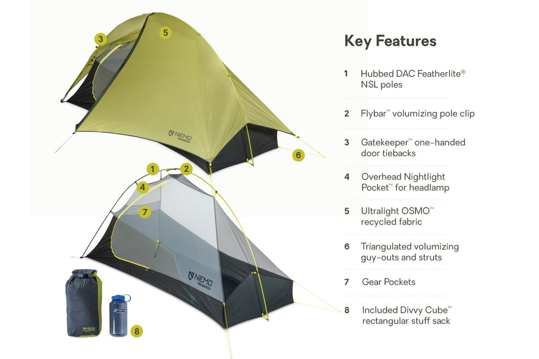 - Volumizing guy-outs connect the inner tent to the rainfly, pulling the sidewalls of the inner tent outward to create more livable space.