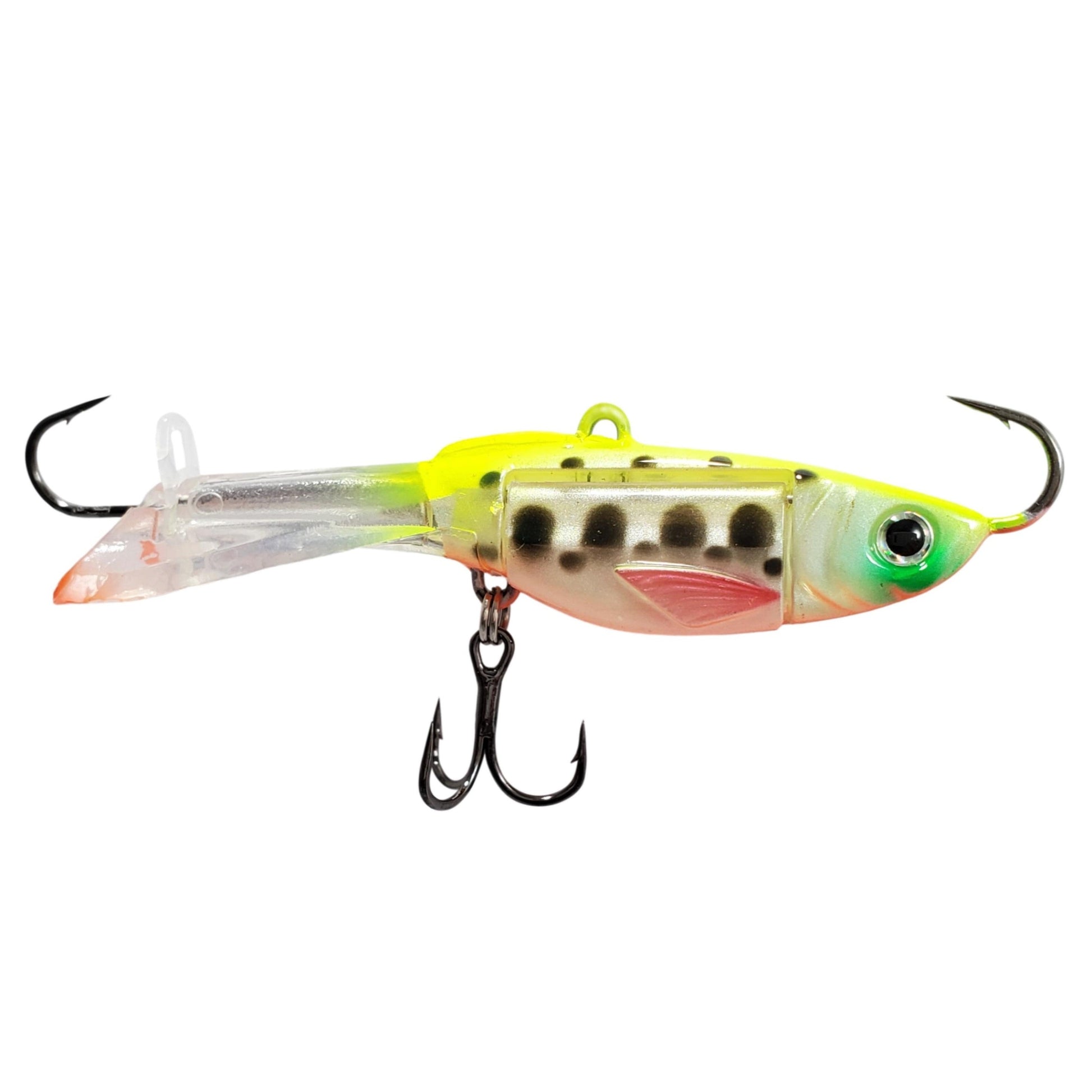The Acme Tackle 2" Hyper-Glide features an injected plastic minnow body with wings that resemble real fish fins. The wings open each time the bait falls and as they open, the bait glides like it's swimming. It can be fished vertically in open water and is perfect for ice fishing. It can also be shaken vertically to make the wings open and close quickly. It can be cast in open water to cover an extreme area as your bring it back to the boat.