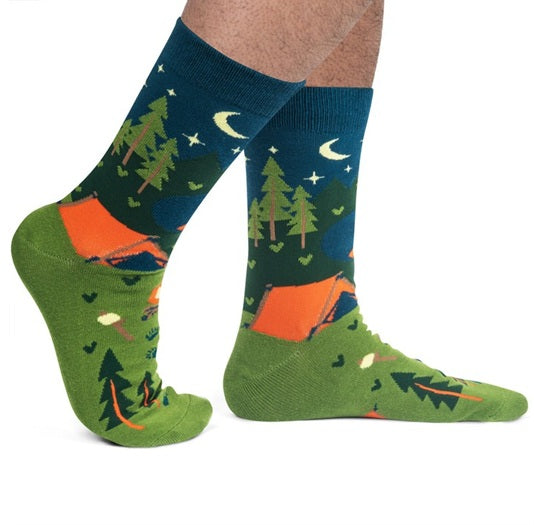 Embrace the great outdoors with these funny camping socks to keep your feet warm and spirits high! The design features a beautiful camping scene complete with bonfire, mountains, lake, canoe, starry night sky and bear prints, while the bottom of the socks showcases a funny saying: “I’d Rather Be Camping.” Any outdoorsy man or woman is sure to love these socks! Perfect for those who enjoy hiking, camping, back-packing and exploring.