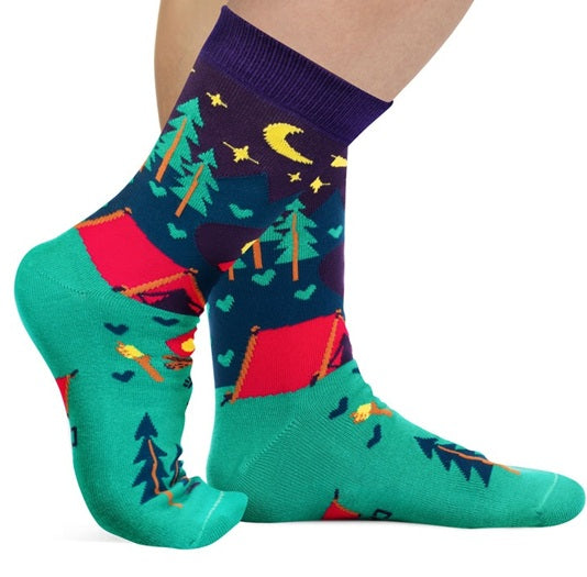 Embrace the great outdoors with these funny camping socks to keep your feet warm and spirits high! The design features a beautiful camping scene complete with bonfire, mountains, lake, canoe, starry night sky and bear prints, while the bottom of the socks showcases a funny saying: “I’d Rather Be Camping.” Any outdoorsy person is sure to love these socks! Perfect for those who enjoy hiking, camping, back-packing and exploring.