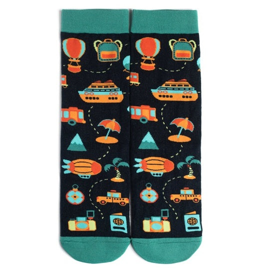 Show off your adventurous spirit with these fun novelty socks for men and women who love travel - Featuring original illustrations of airplanes, trains, cruise ships and more, along with a funny message on the bottom: "I'd Rather Be Traveling". They’re a perfect way to say “Bon Voyage”, a gift that travelers can bring on their trip - and you should always pack an extra pair of socks!
