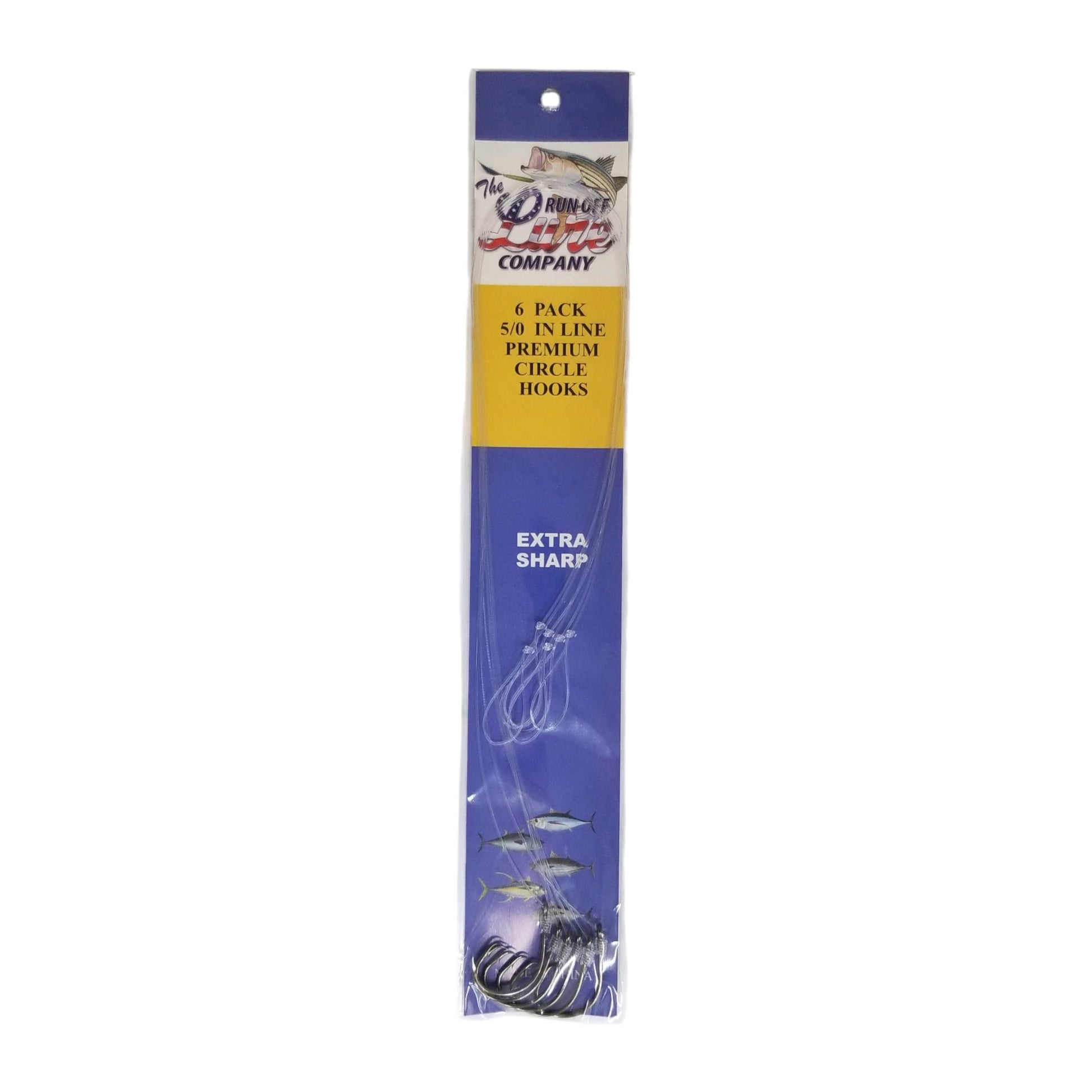 The Run Off Lures Inline Premium Snelled Circle Hook features a size 5/0 circle hook. These extra sharp hooks are great for both freshwater and saltwater fishing. This pack contains 6 hooks.