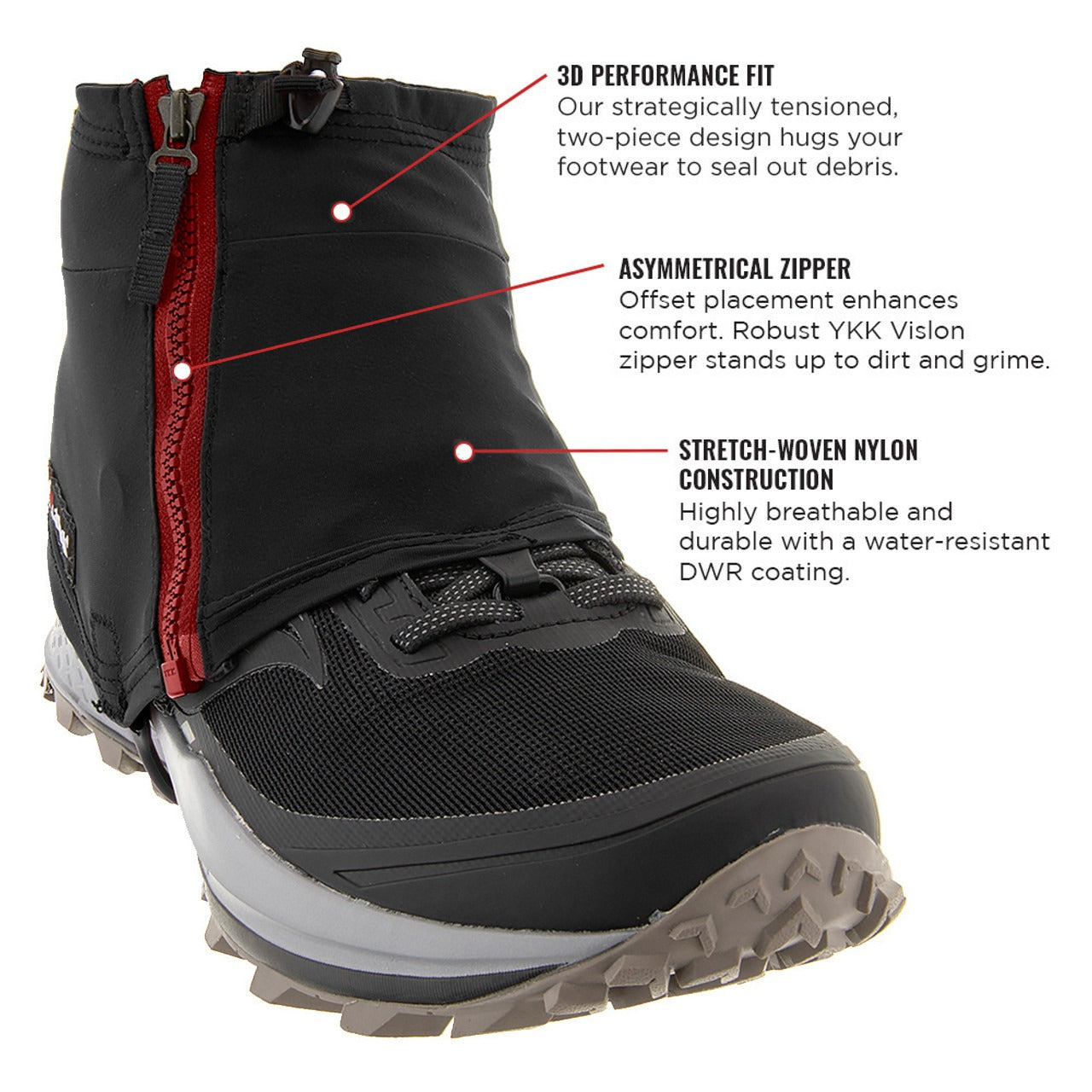 - Side Zipper Closure – Asymmetrical placement enhances comfort and makes putting on and taking off gaiters effortless. Durable YKK VISLON® zippers deliver smooth, reliable performance in dirty and dusty conditions.