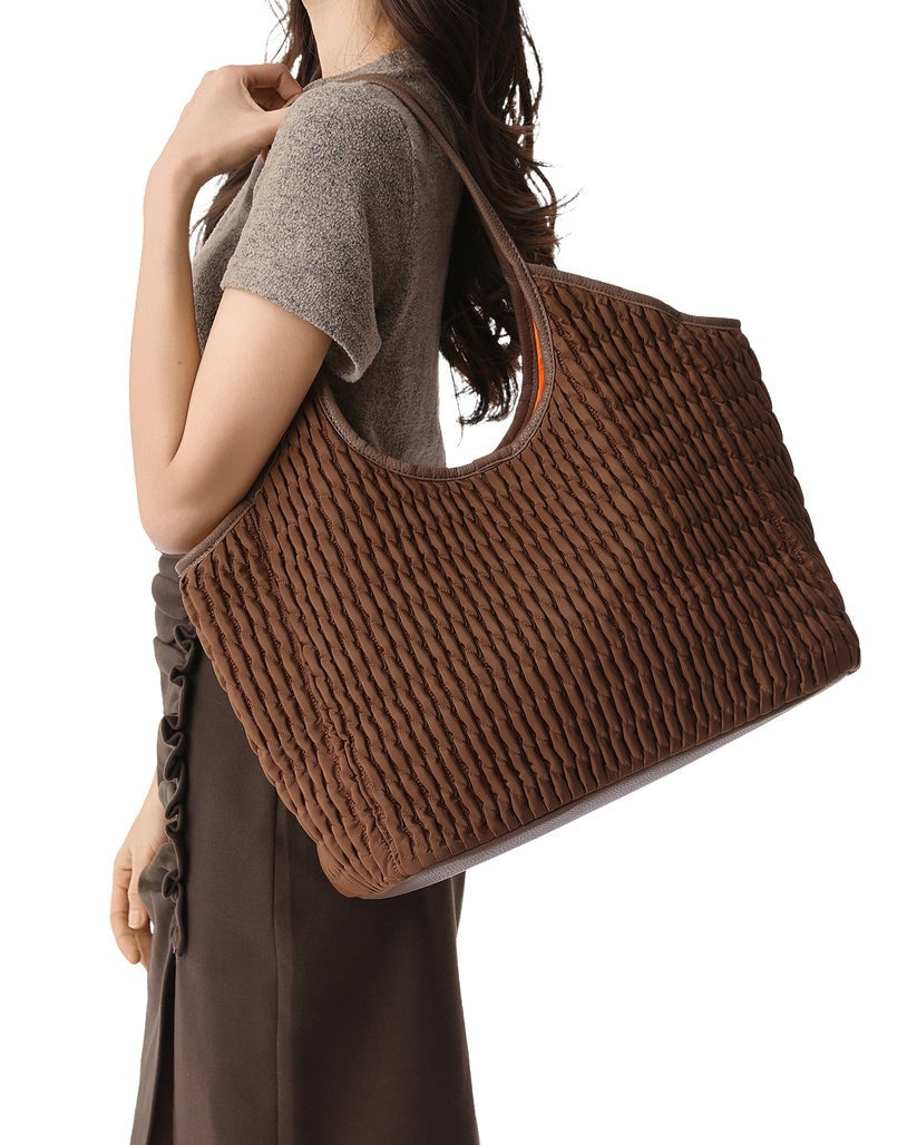 - Nylon Puckered Puffer Tote with magnetic closure and removable wristlet pouch.