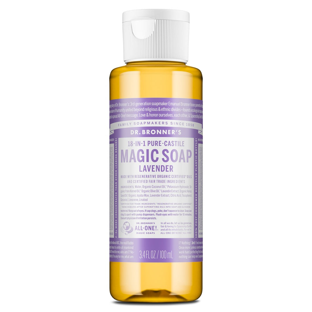 Relax and unwind with the calming scent of Dr. Bronner’s Lavender Liquid Soap. Infused with pure French lavender essential oil, this true soap creates a rich, smooth lather that rinses clean. Made with Regenerative Organic Certified® oils, it gently cleanses while filling the air with a soothing, genuine scent. No detergents, dyes, or added foaming agents. Vegan, made with organic oils, fair trade, and EWG Verified®—for a clean that renews body and soul.