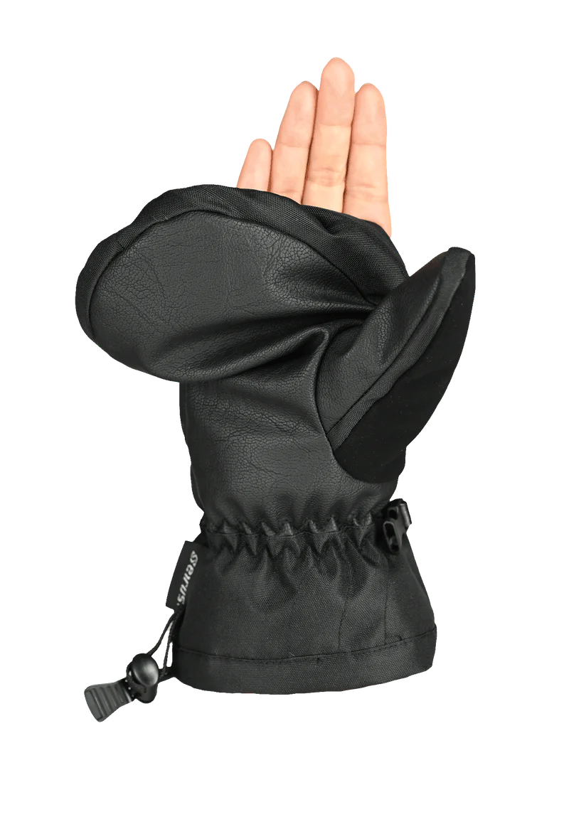 Warmth of a mitt, dexterity of a glove. Keeps the elements out. Magnetic seam allows fingers instant freedom. Snaps closed for quiet performance in the field.