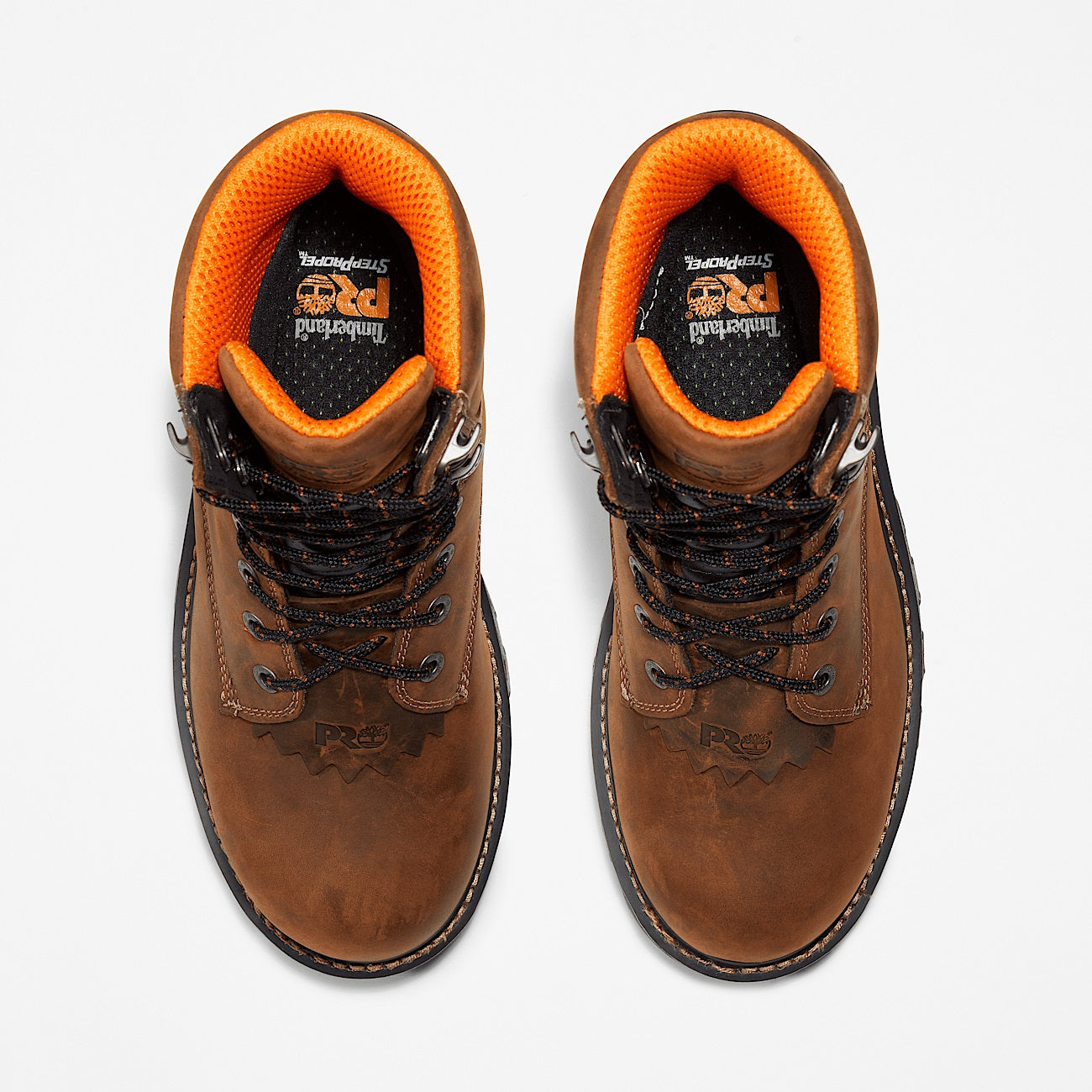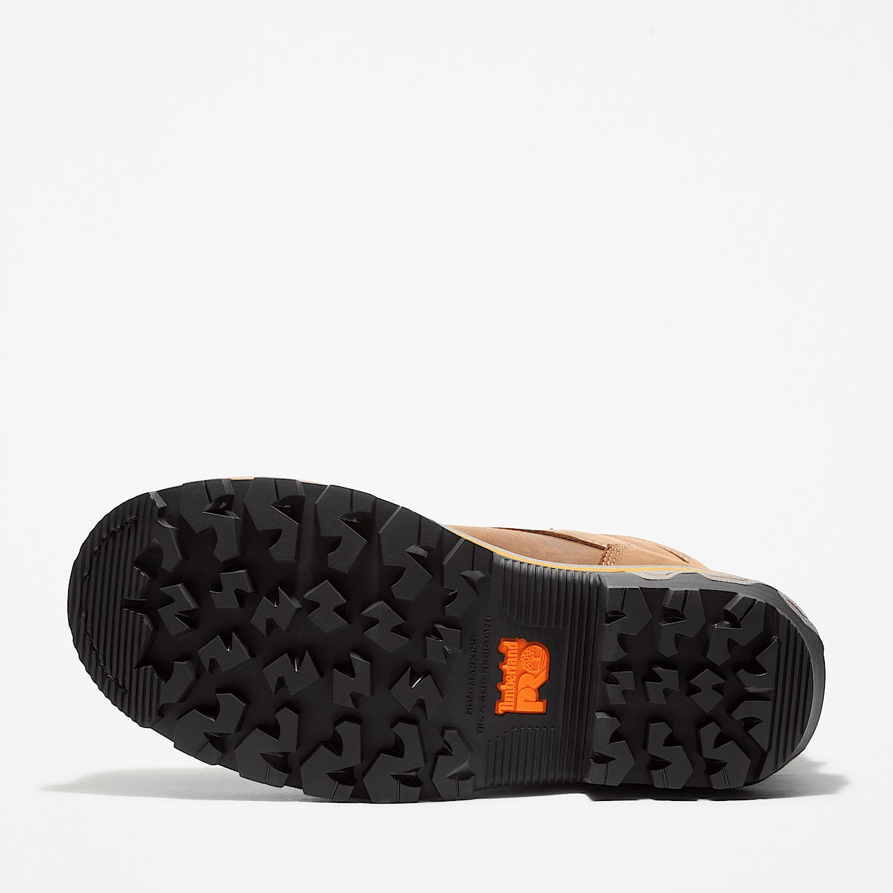 Our rugged, waterproof logger boots are designed to tackle the toughest job sites. These 8" tall, soft-toe boots are made with premium Timberland® waterproof leather uppers and an internal waterproof membrane that helps make them impervious to the wettest conditions and blood-borne pathogens. We added electrical hazard protection, ExoSpine™ technology and triple-ribbed steel shanks for lasting structural support, plus heat-, oil-, slip-, and abrasion-resistant, non-marking, All-Weather TPU outsoles. For all-day comfort, you'll find StepPropel™ footbeds that compress to store your energy and then rebound to release that energy back to your feet with every step, breathable and moisture-wicking linings made of ReBOTL™ fabric containing at least 50% recycled plastic, and an antimicrobial treatment for odor control.