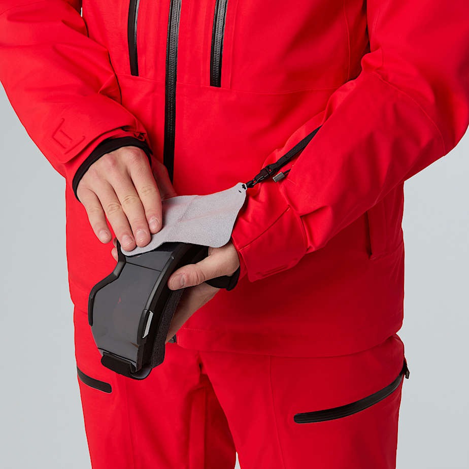 - Covered, secure-zip wrist pocket with a goggle wipe