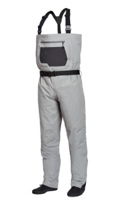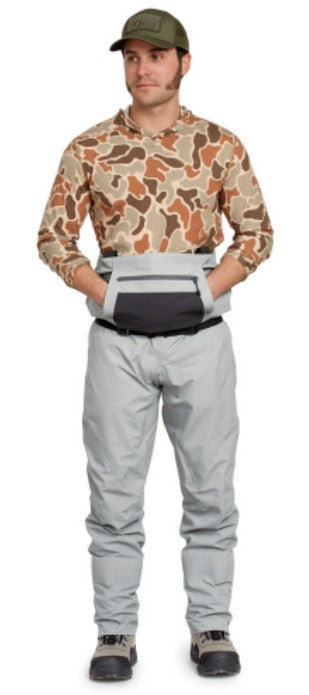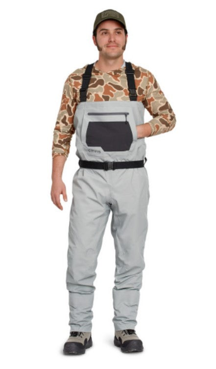 This new Clearwater fly-fishing wader for men is feature rich and built with a modern fit to eliminate traditional bulk. Four-layer waterproof breathable nylon fabric is light yet durable, with a 30K Waterproofness / 8K Breathability rating. Opposing side-release buckles allow for waist-high conversion on warm days. External storage pocket with stretch panel for small items and fly boxes, plus a kangaroo-style handwarmer pocket on the front chest. Updated anatomical neoprene booties with Integrated neoprene gravel guards to reduce water drag and collection. Low-profile seam construction and low-profile belt loops with 1½" webbing belt included. Hook and loop patch on interior pocket to attach Orvis waterproof pocket (8G3H sold separately).