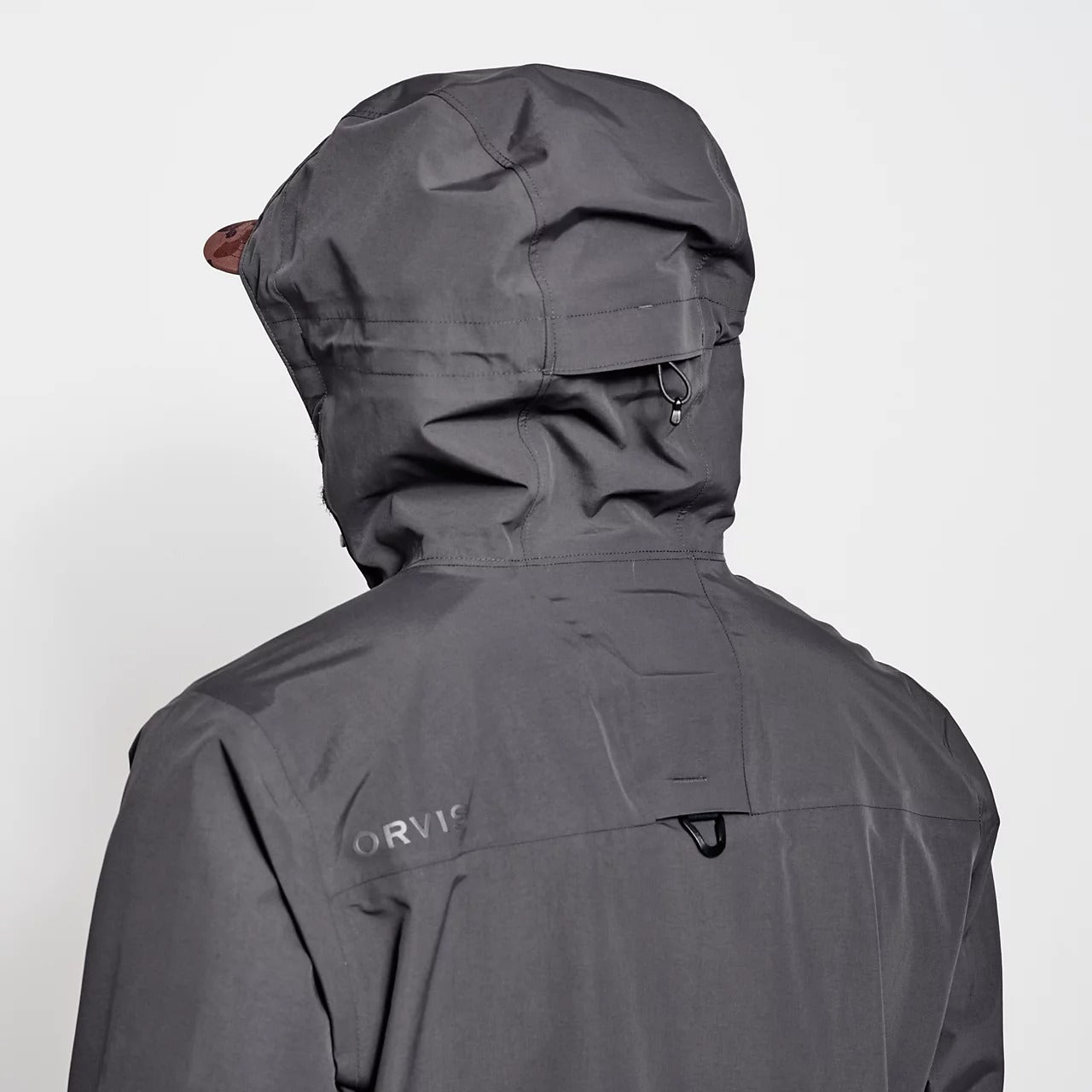 The Orvis Men's Clearwater Wading Jacket is an exceptional value in a full-featured wading jacket with 20K waterproofness and 15K breathability rating. It features three-layer nylon shell fabric with fully taped seams for superior weatherproofing and a YKK AquaGuard water-resistant front closure. It also has two large front storage pockets and two handwarmer pockets. Integrated neoprene cuffs seal off vulnerable water entry points. The rear yoke D-ring acts as a net attachment and a three-way adjustable storm hood with laminated brim keeps you comfortable. It has an adjustable hem for secure fit, and a DWR (Durable Water Repellent) finish repels water from the fabric surface.
