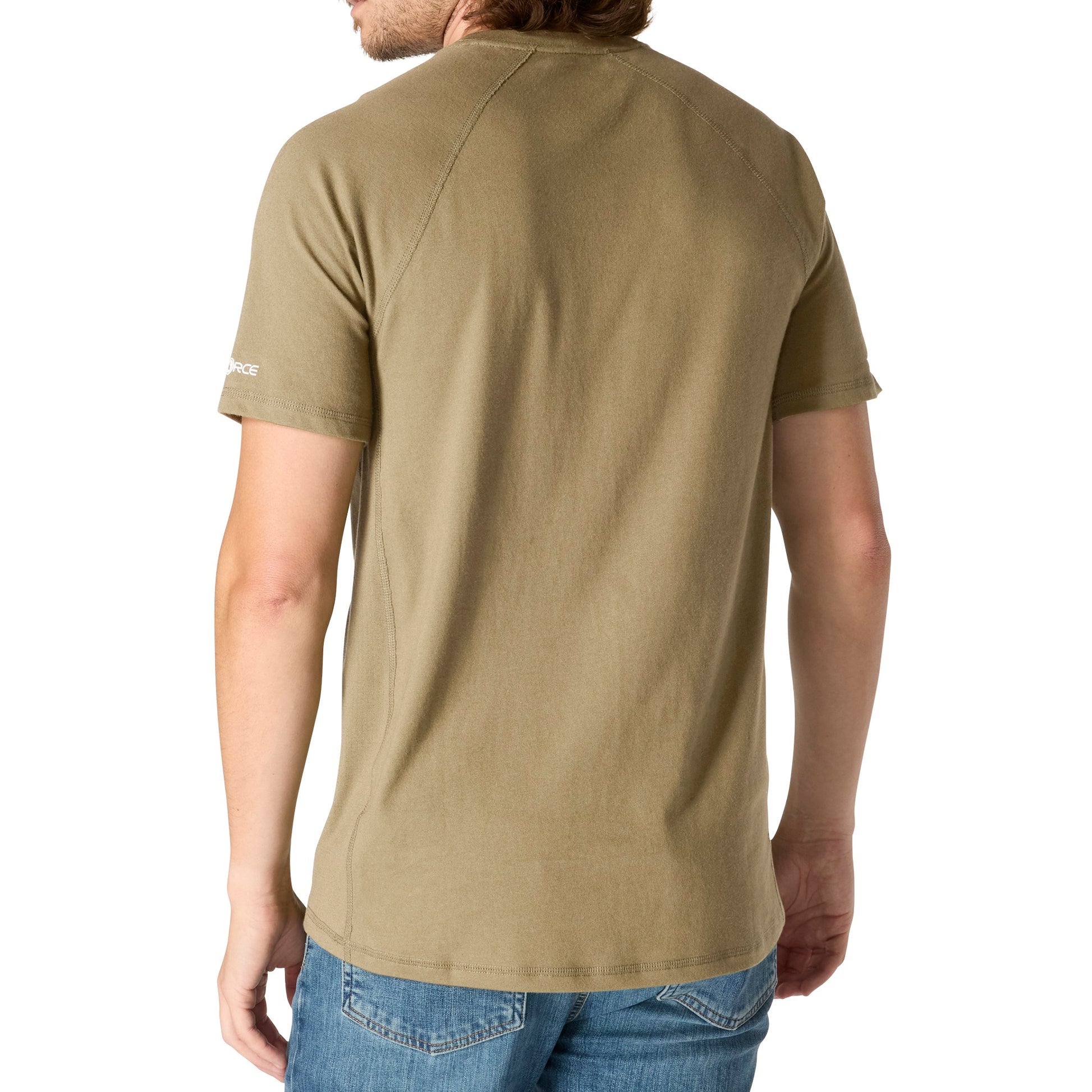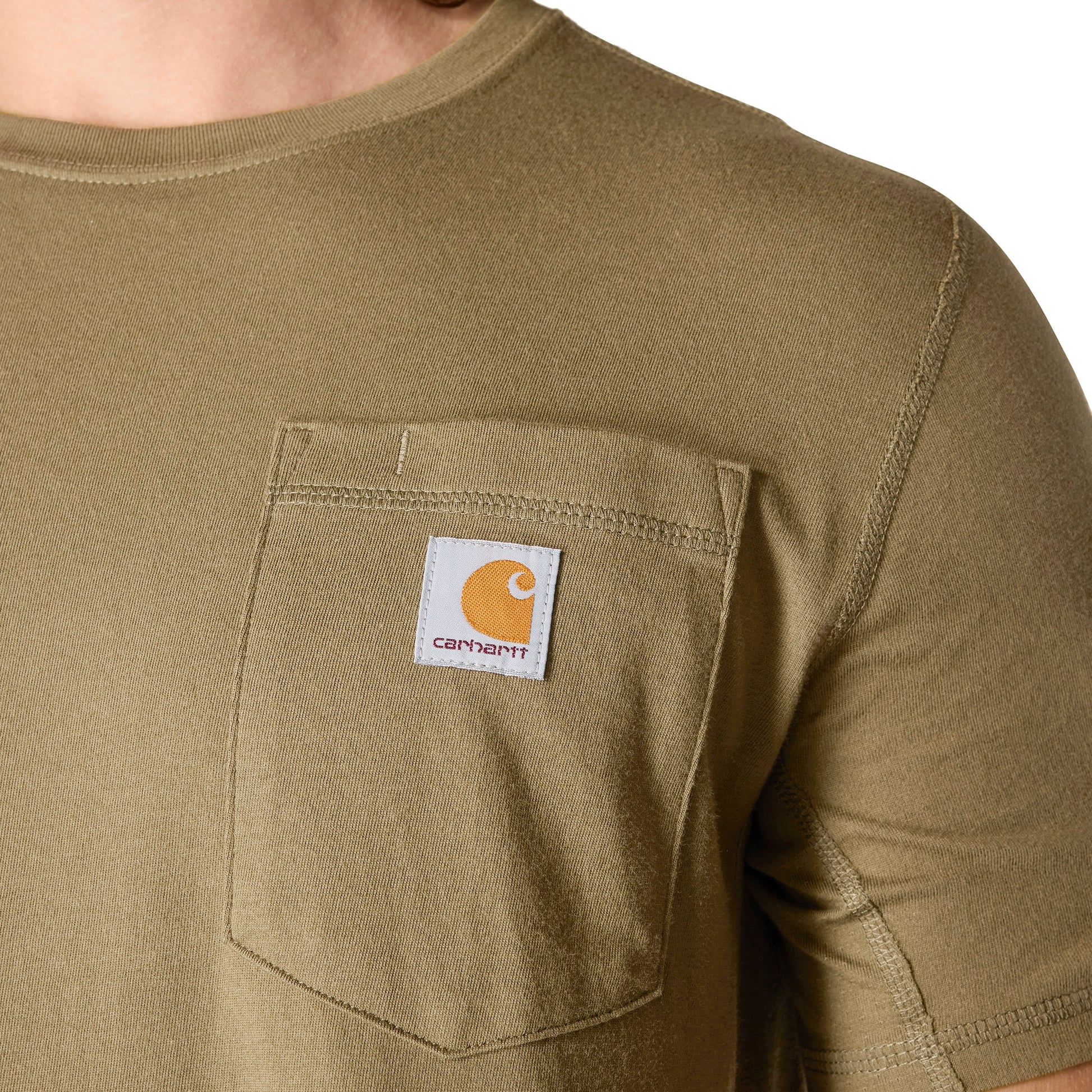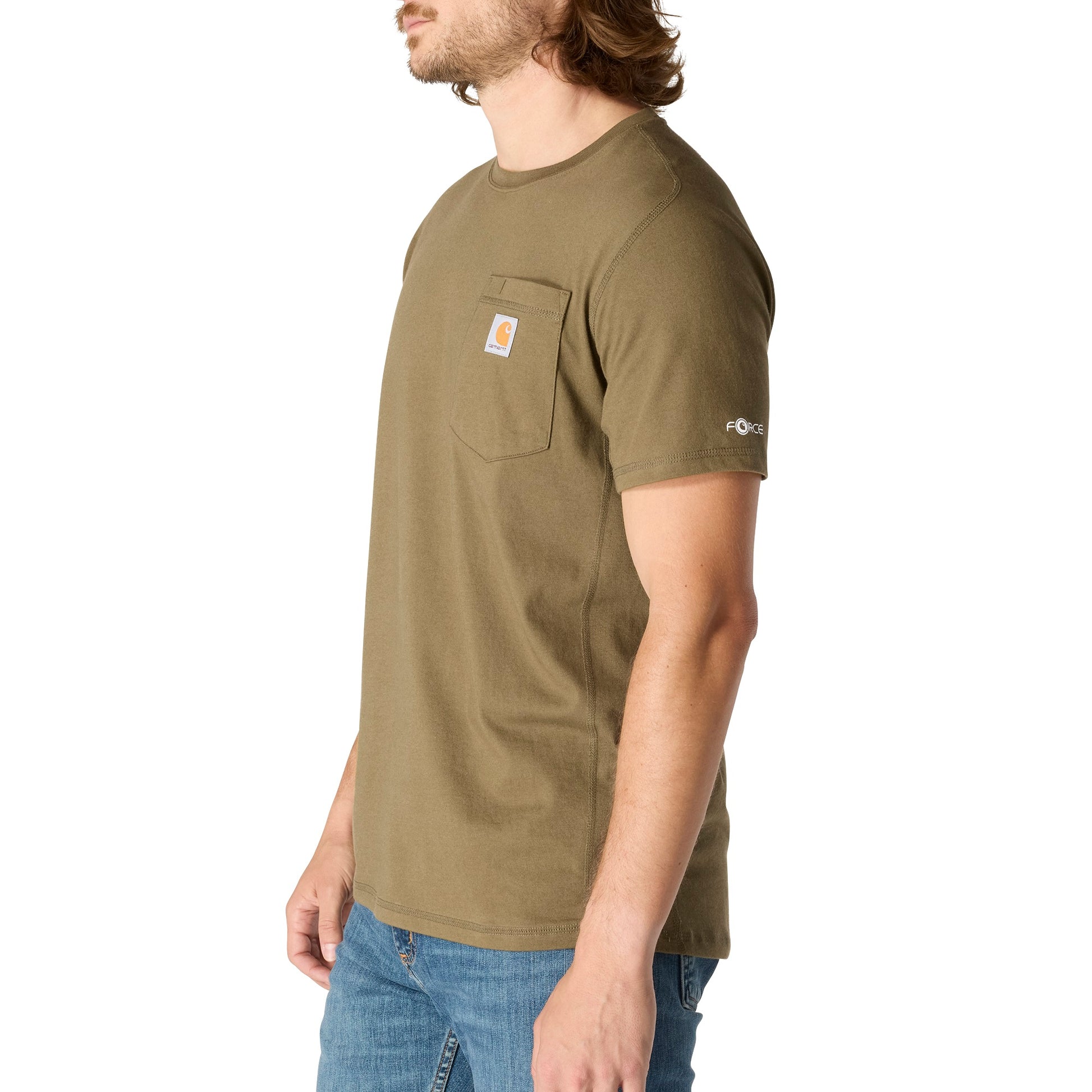 It's much more than a t-shirt! The Carhartt Force® Relaxed-Fit Midweight Short-Sleeve Pocket T-Shirt for Men features advantages to keep you comfortable when you're working. When it's hot at the job site, built-in Carhartt® Force technology wicks sweat for quicker evaporation. The advancement of FastDry® keeps you feeling cool all day long, and the UPF 25+ sun protection shields your skin from the sun's harshest rays. Smooth flatlock seams add itch-free comfort. Raglan sleeves ensure freedom of movement. Ventilated side panels promote cooling air circulation. Other features include a drop-tail hem, tagless neck label, and a left-chest pocket with pen stall.