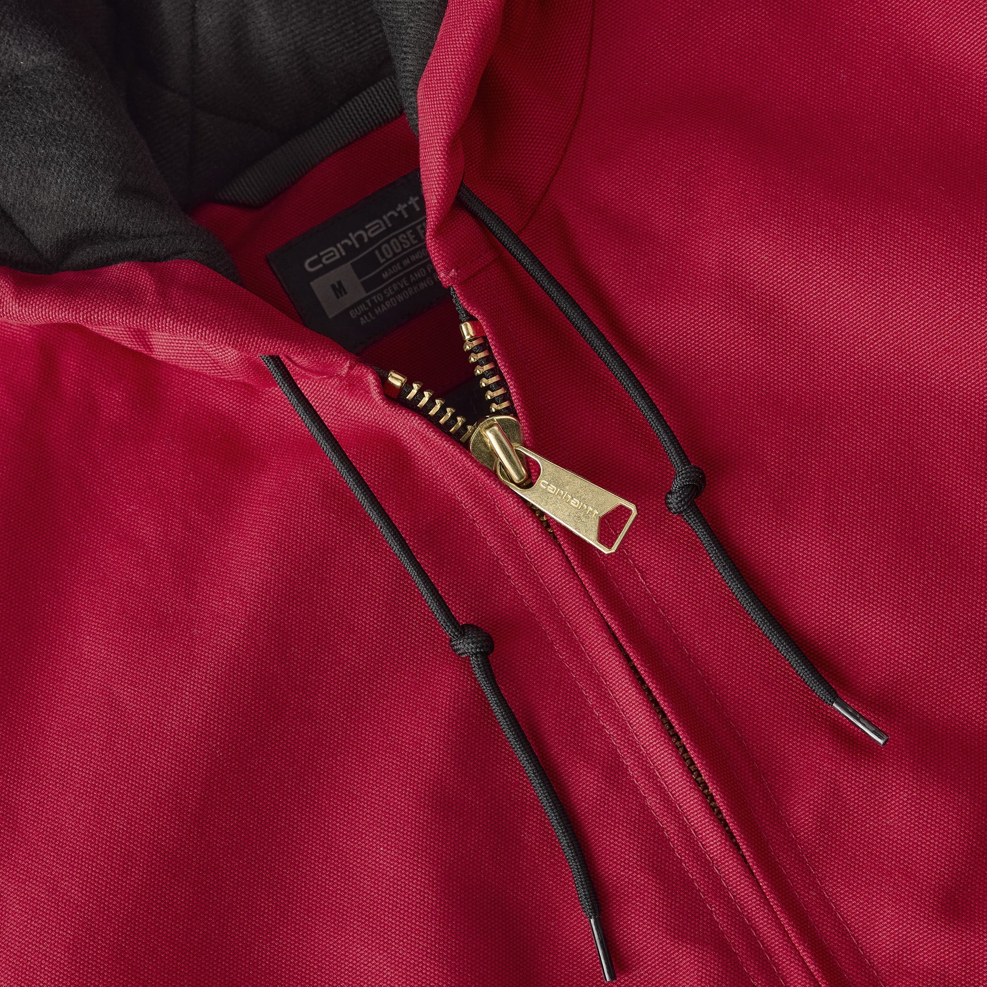 - Attached quilted-flannel-lined hood with draw-cord closure