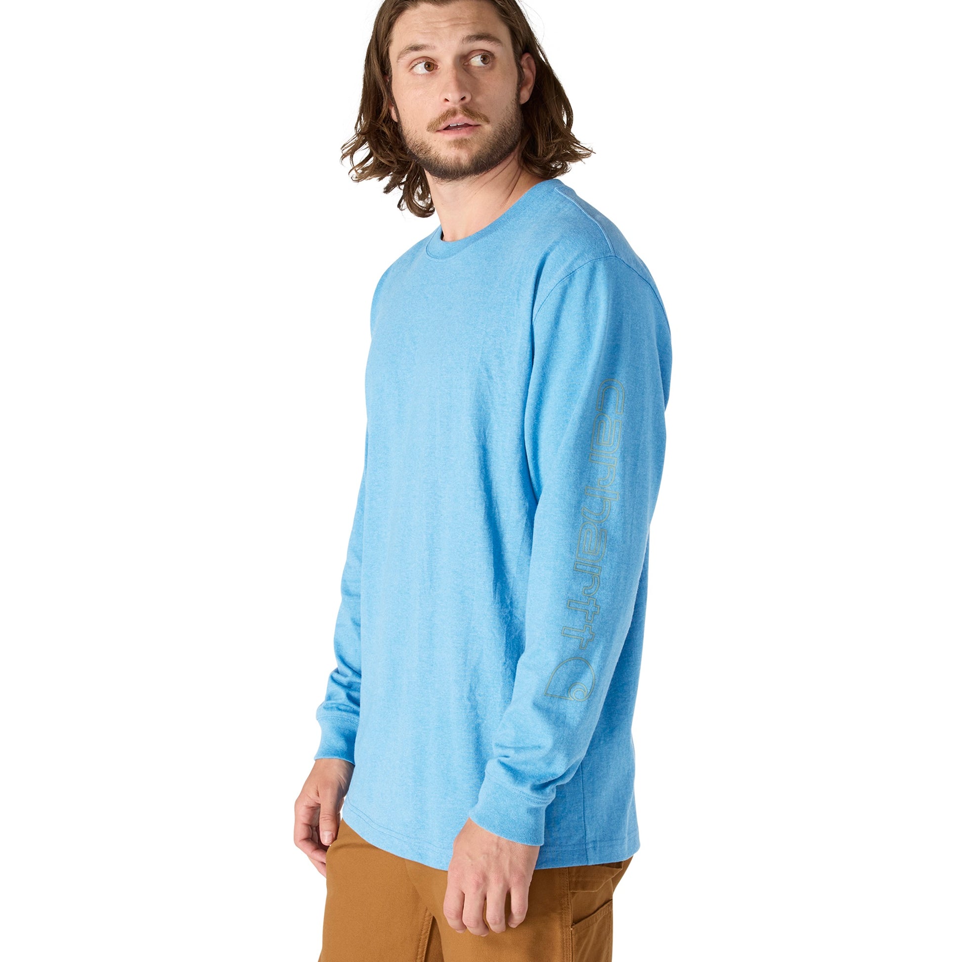 Since 1889, Carhartt has made durable workwear you can count on as you tackle the toughest jobs. This men's long-sleeve t-shirt bears the name proudly on the sleeve. It's made of heavyweight cotton jersey and cut generously for a roomy fit.