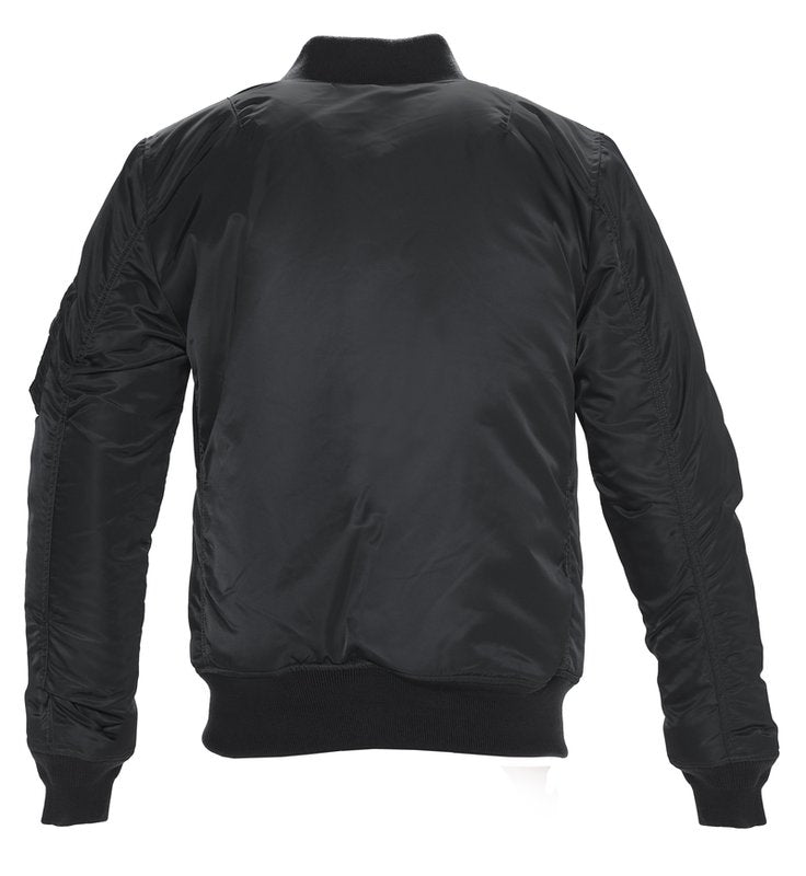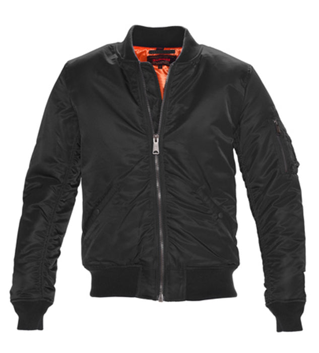 Traditional Ma-1 flight jacket is 27" and constructed with nylon flight satin with tonal Schott embroidery on left sleeve above military pocket.