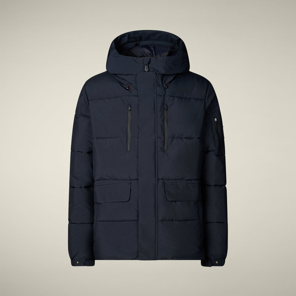 The Alter model men’s parka is designed to handle all weather conditions in an animal-free style. Warm and padded with heat-sealed quilting, it blocks out wind and cold with a water-resistant central zip hidden beneath a snap-button flap. The adjustable hood can be zipped into a high collar when needed, and an internal drawstring lets you customize the fit at the hem. Multiple pockets—including zipped chest and interior pockets, plus double lower pockets lined in soft flannel—offer both comfort and functionality. Finished with a logo patch on the sleeve.