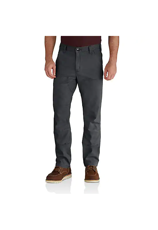 These Carhartt Men's Rugged Flex Rigby Double Front Pant is a great midweight work pant that allows a full range of motion for getting any job done. When the job keeps you on your knees, these men's purpose-built pants feature the added durability of a double-front design and the convenience of knee pad compatibility. A midweight canvas blend offers the perfect amount of stretch for easy movement. They've got all the traditional jean pockets plus a secure right thigh phone pocket and a left thigh utility pocket for your knife.