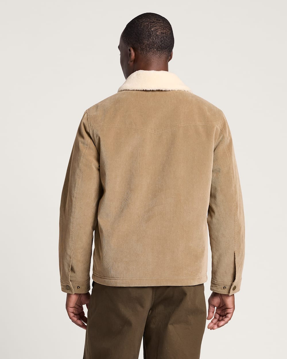 Warm and textured, this classic trucker jacket is crafted with plush wide-wale corduroy and a water-resistant membrane. Features a button-off collar, side-seam lower pockets, functional chest pockets, and secure inner pockets. The zip front has a logo-snap storm placket, making it a rugged, stylish layer for cool-weather adventures.
