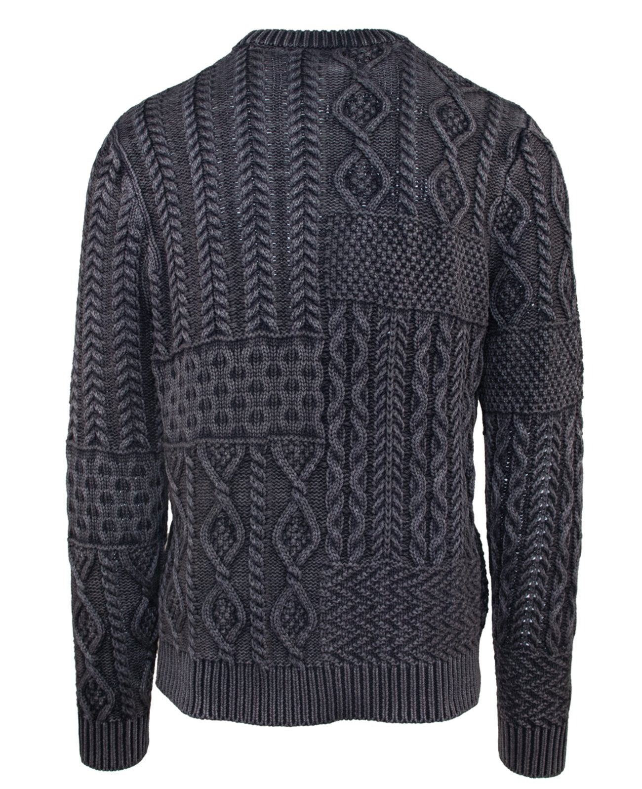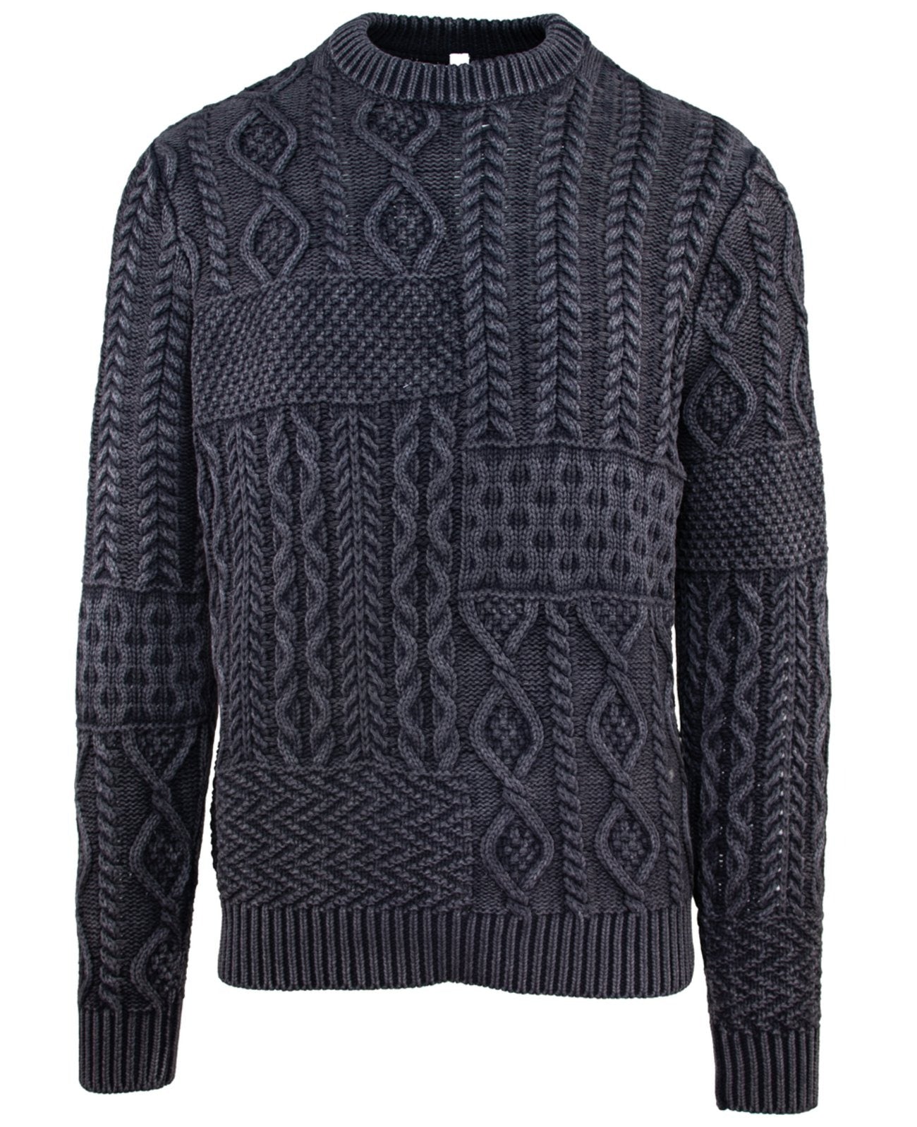 A rugged, heavyweight stonewashed cotton fisherman's sweater featuring a distinctive patchwork cable knit design for a textured, classic look.