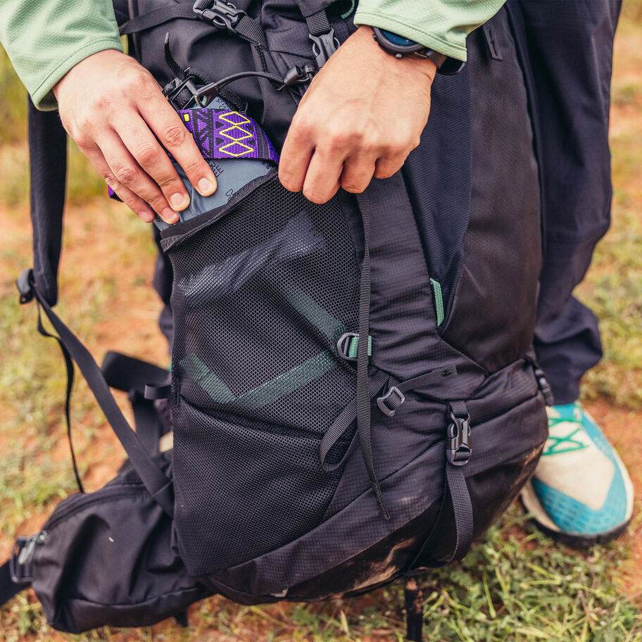 • Dual side mesh pockets featuring side trail access with top and bottom compression straps