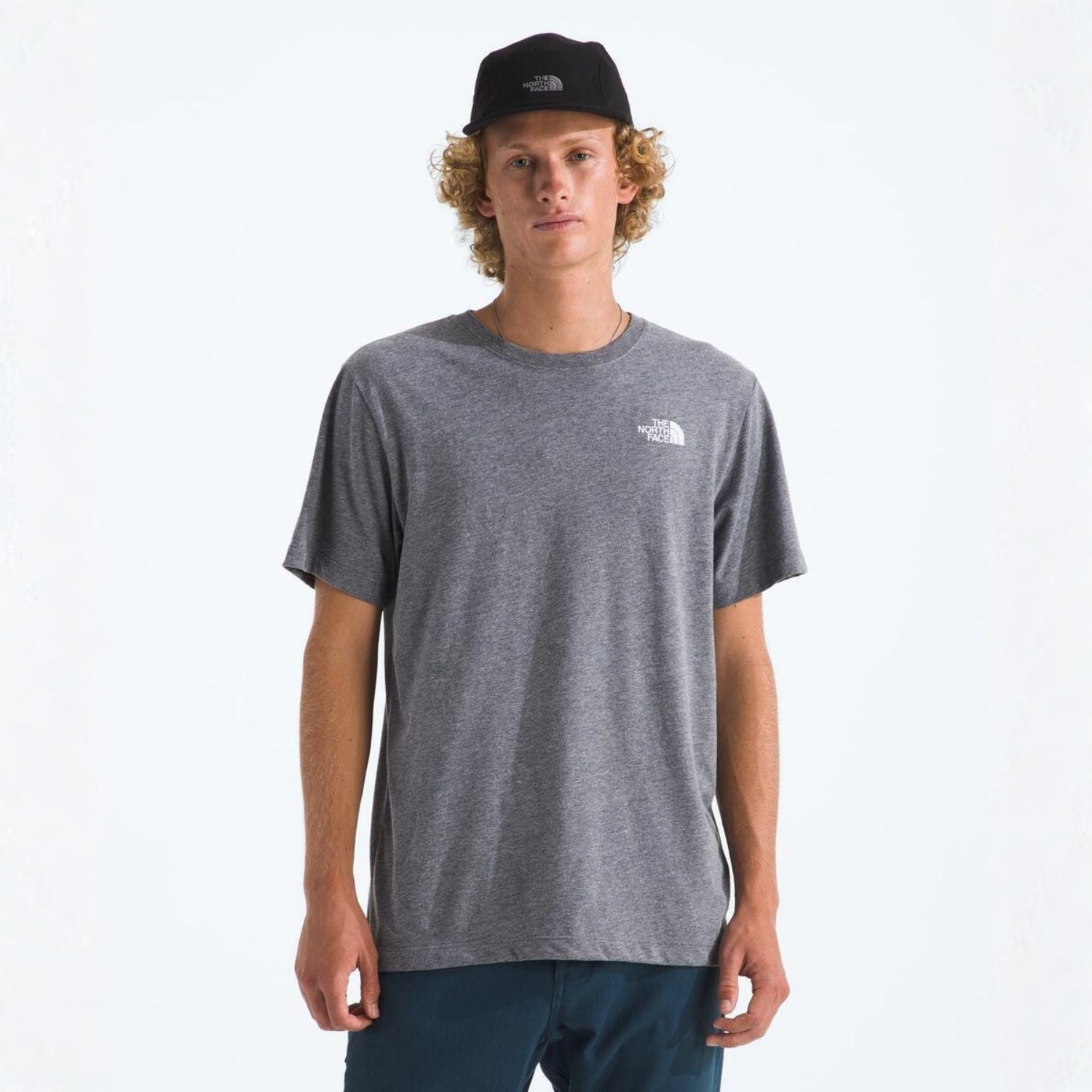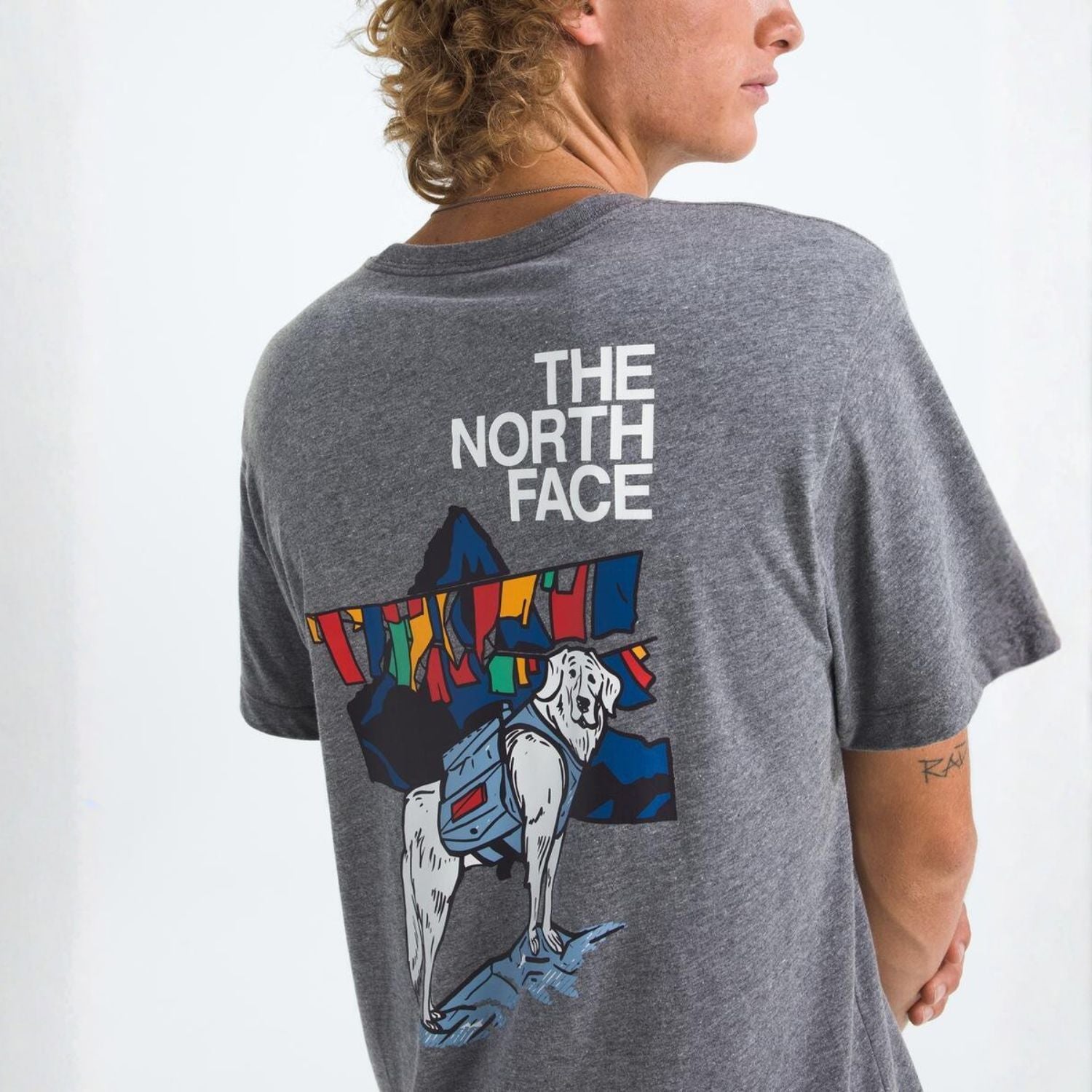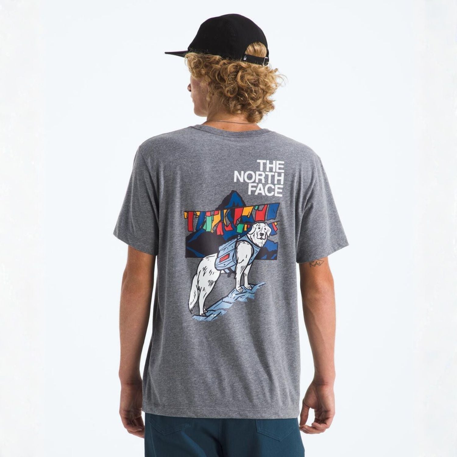 From The North Face, this t-shirt features: Ribbed collar Set-in sleeves "The North Face" logo and icon logo detail on the front "The North Face" logo and a dog graphic on the back Pullover construction Relaxed fit Solid body and rib of climate conscious cotton Machine wash/tumble dry Imported.