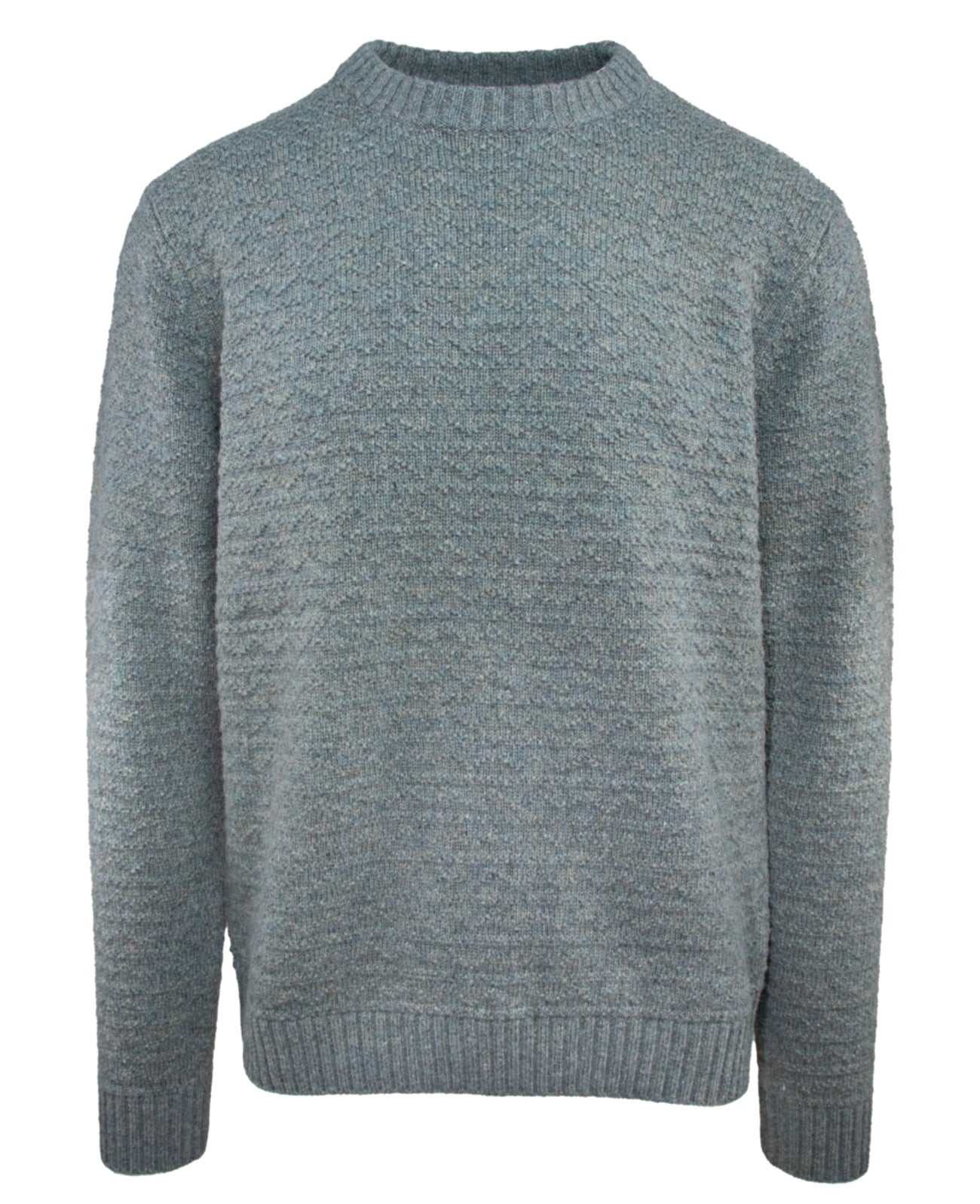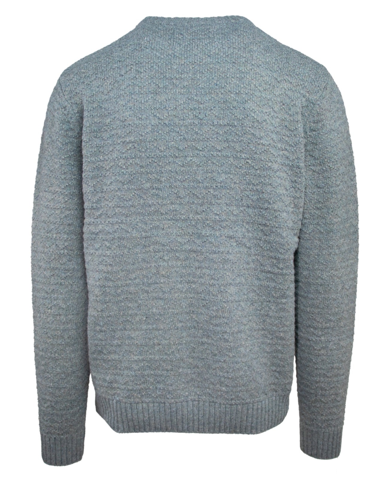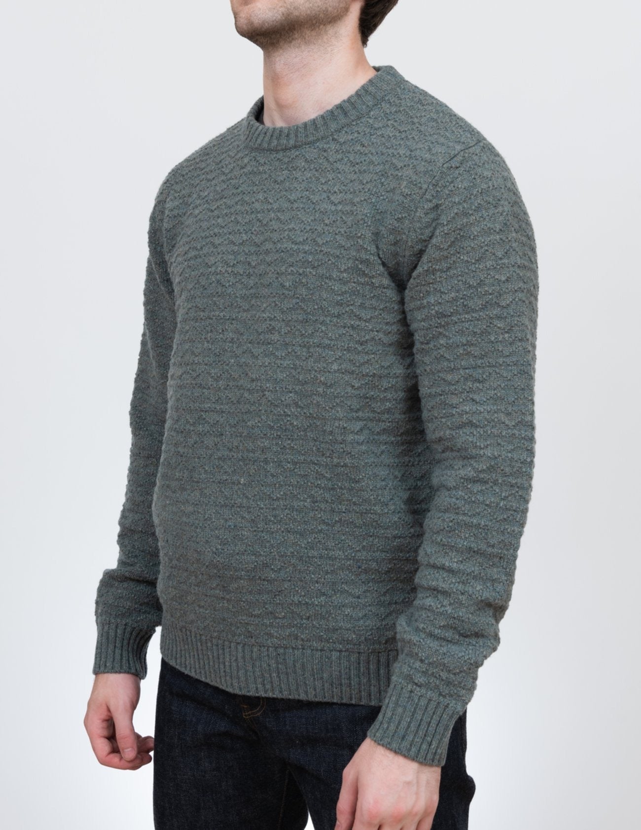 Midweight wool blend horizontal zig-zag knit crew neck sweater. 80% wool, 20% nylon