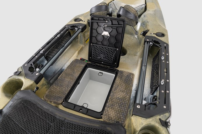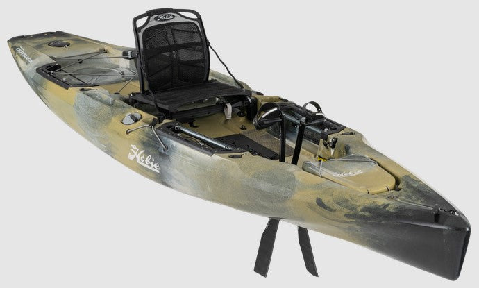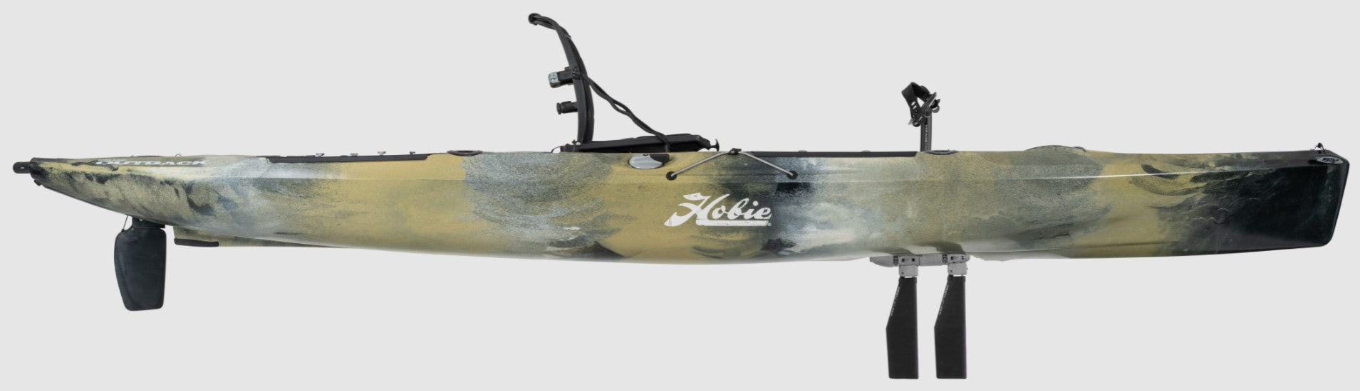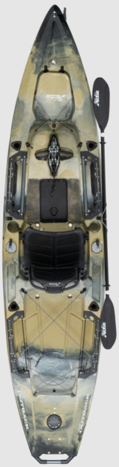 The Hobie Mirage Outback is a larger and faster alternative to the Sport that enables anglers, hunters, divers or photographers to enjoy their hobby with fingertip rudder control. Anglers will especially appreciate built-in rod holders and the Lowrance-Ready built-in transducer mount that features pre-installed through-hull cable plugs.