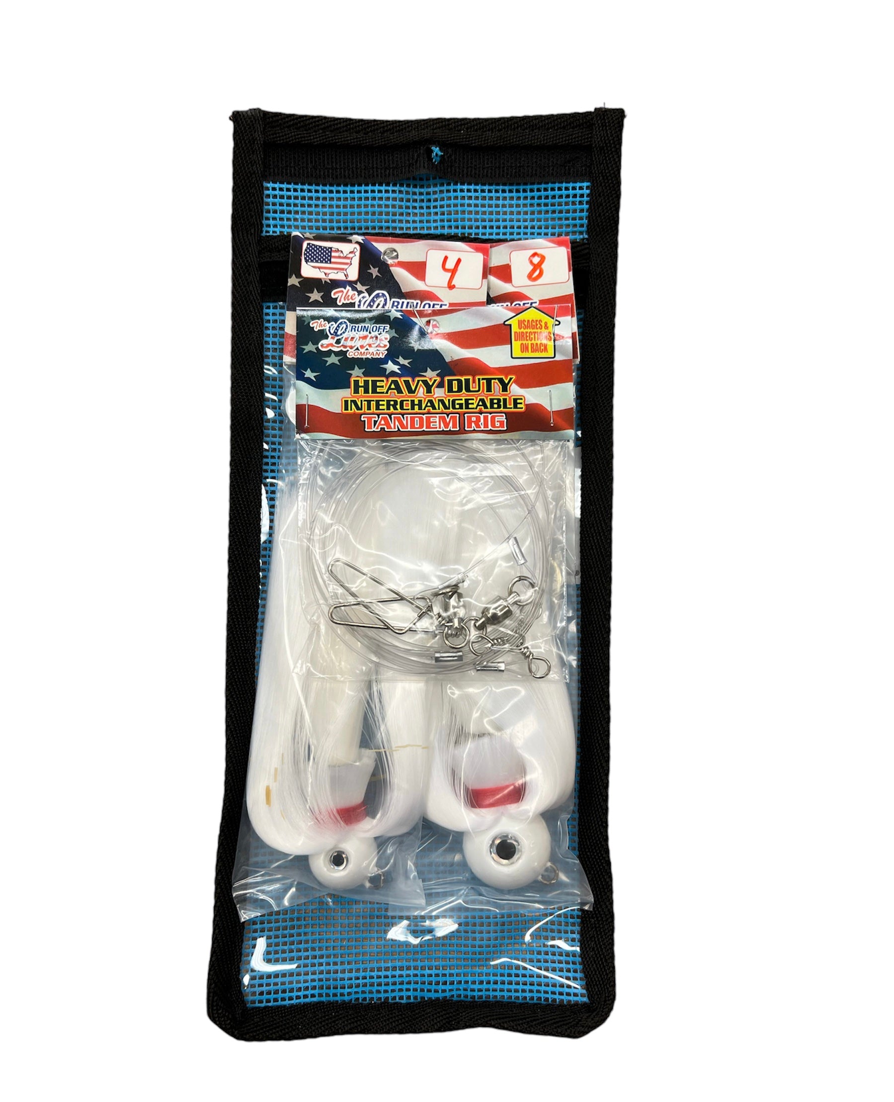 The Runoff Lures 4oz/8oz Mojo Starter Kit includes two mojo trolling lures, one 4oz and one 8oz, plus a heavy duty interchangeable tandem rig. All you have to do is clip on the lures and troll up some striped bass or bluefish. You can start off with the two mojos, and easily swap out the lighter mojo for a spoon if you are faced with tough conditions.