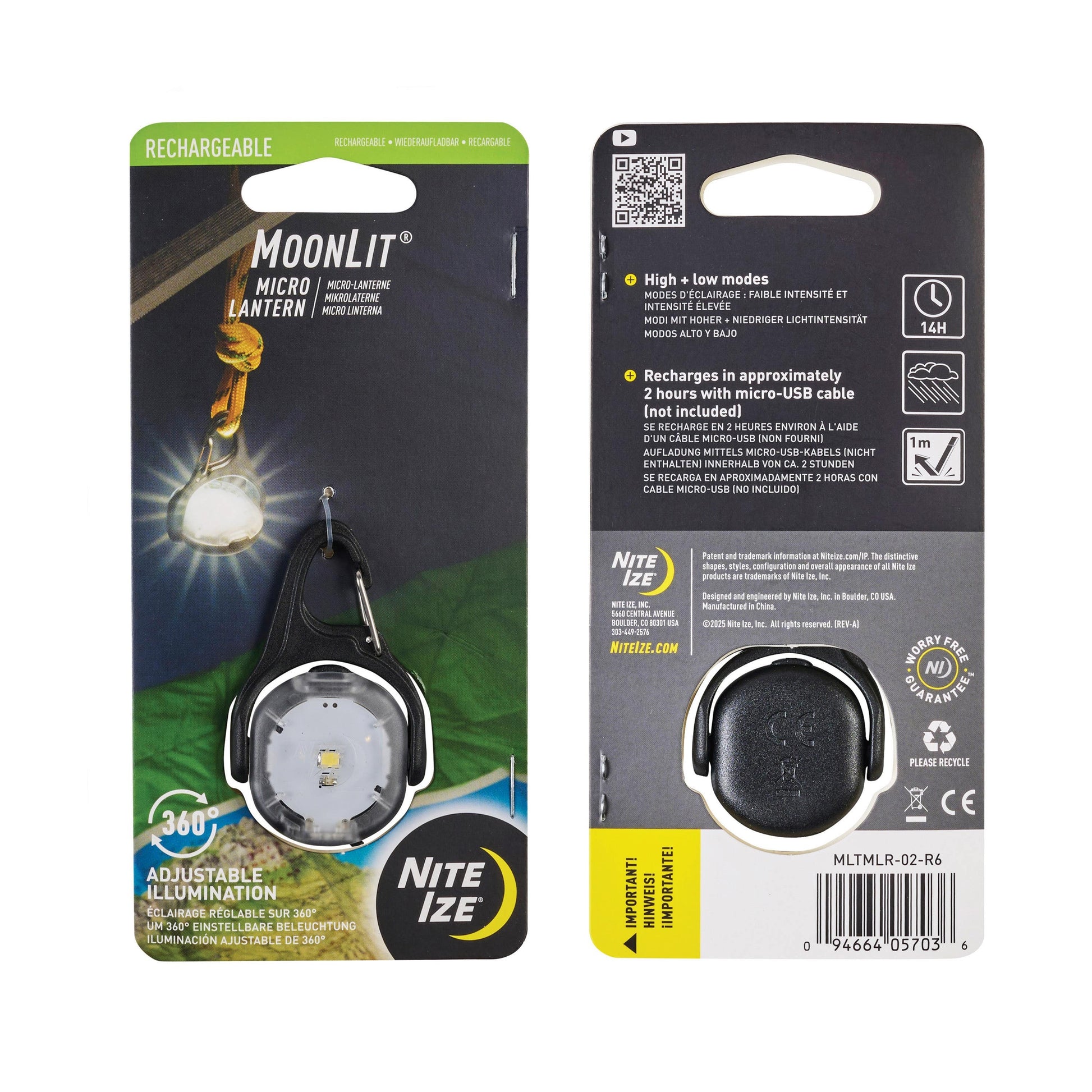Every nite is a full moon with the MoonLit Rechargeable Micro Lantern. Featuring a lightweight, drop-tested body and built-in carabiner clip, this portable light shines on clear and cloudy nites alike so you can always maintain visibility at the campsite or on-the-go. Just like the real moon, MoonLit has its phases too: Simply rotate the 360° swiveling body to find the perfect angle to shine, locking in 4 positions. Push the button on the weather-resistant body to activate the white moonglow and choose from high and low modes. MoonLit recharges in 2 hours with a micro-USB cable (not included) and glows up to 14 hours on low or 3 hours on high.