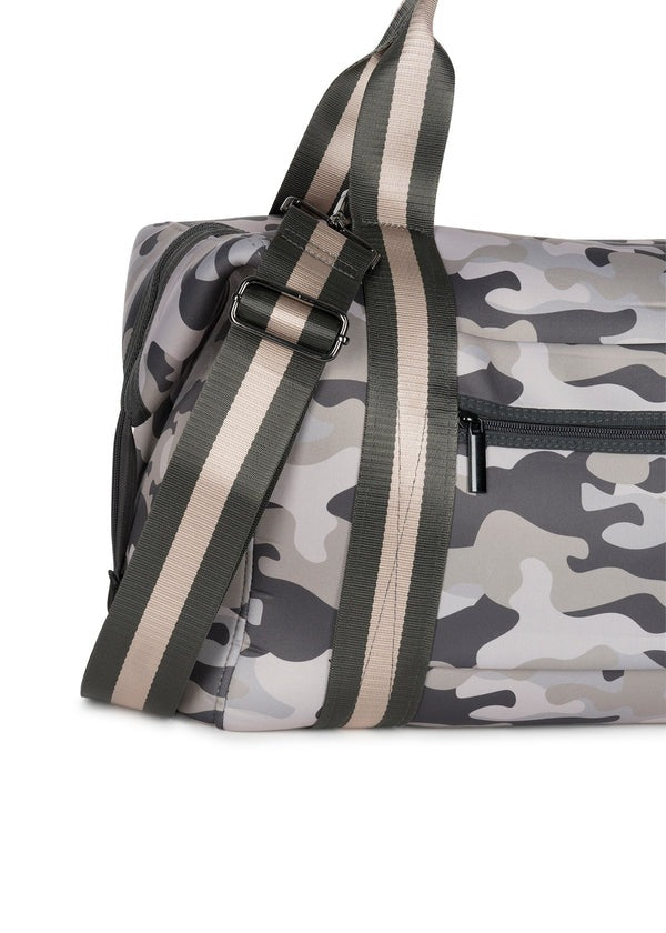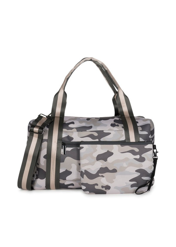 - Neoprene weekender with interior pouch and pockets.