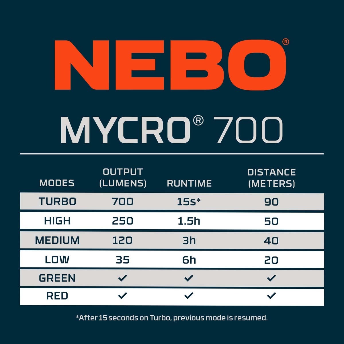 - Turbo (700 lumens / 90 meters)