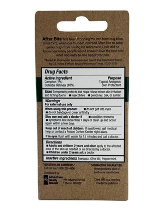 Stop the itch and discomfort from bug bites using the After Bite® Natural Itch-Relieving Stick, a clean-ingredient solution by the #1 pharmacist-recommended brand. Oatmeal and camphor work together to naturally moisturize, cool, and then warm skin to relieve itchiness associated with mosquito, biting fly, and fire ant bites and bee stings. The itch-relieving balm also works for skin irritations caused from poison ivy, oak, and sumac. After Bite Natural Itch-Relieving Stick makes it easy to apply for the whole family to apply the balm directly on bites, and the convenient size packs easily for travel. Paraben- and cruelty-free.