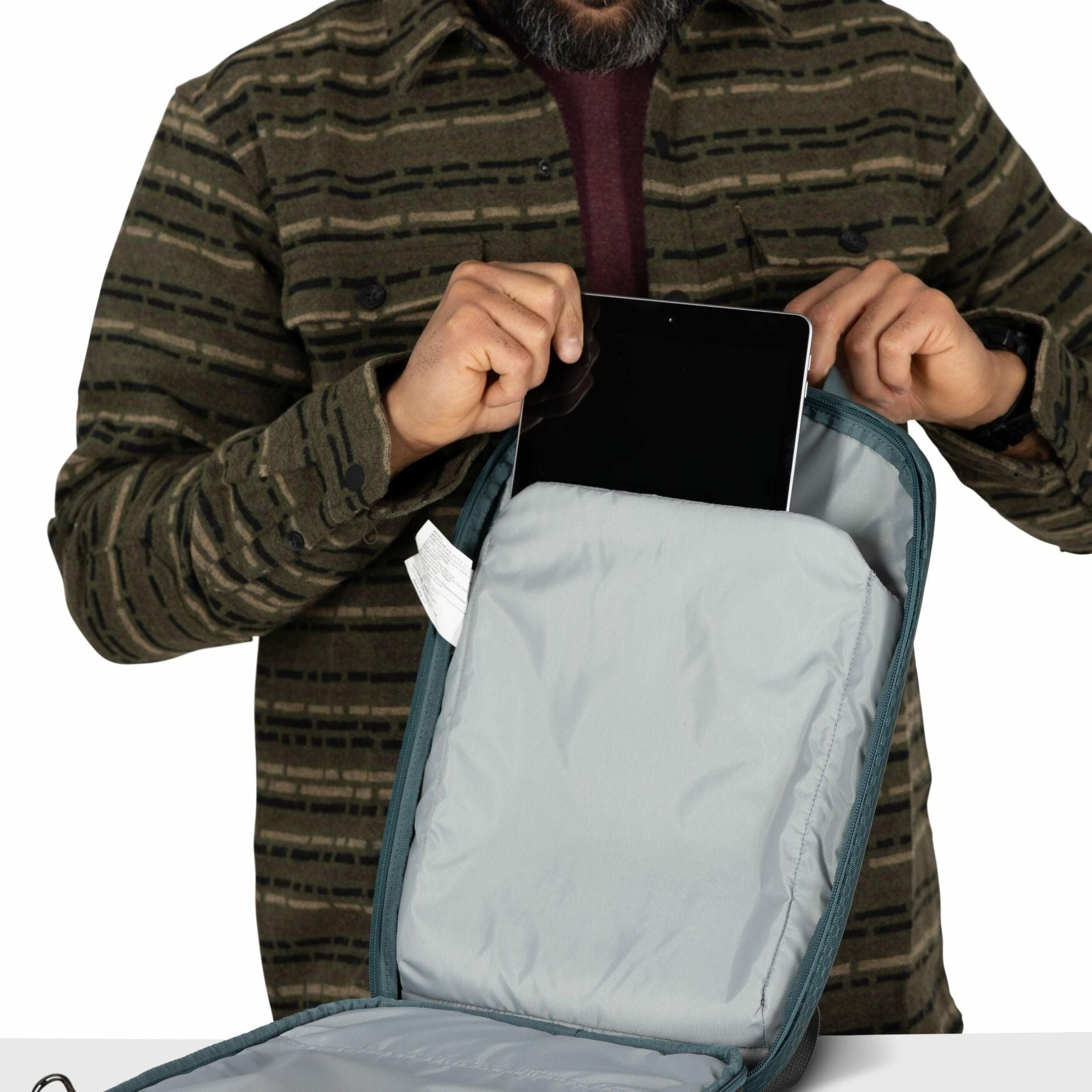 Everyday Needs: Compact and organized for your daily needs, with a 14” laptop sleeve, cell phone shoulder strap pocket and space for a 40-ounce water bottle.