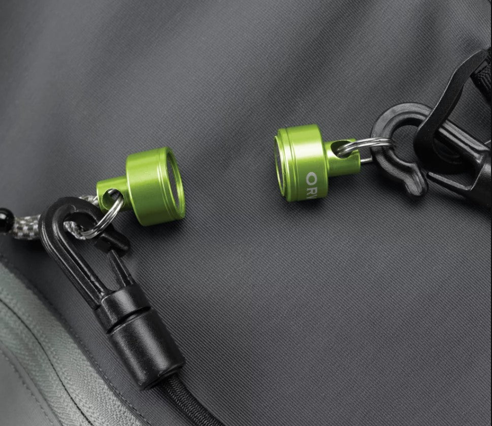 - Upgraded, durable bungee and split ring clips for securing to pack or vest.