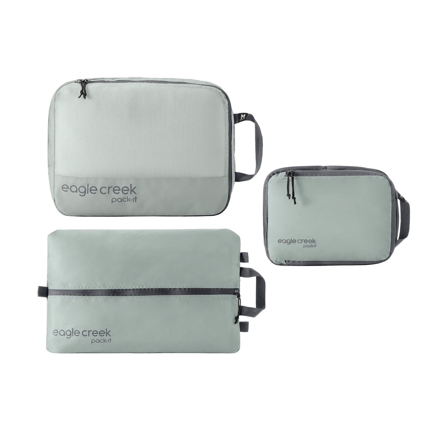 The Pack-It Essentials Set is a trio of multitaskers that protects clean clothes from dirty gear and helps you pack more. Squeeze shirts, underwear and socks into a space-saving compression cube. Separate clean from dirty clothes and easily spot items using the mesh-topped, dual-compartment Reveal cube. Even dirty shoes stay segregated thanks to the Shoe Sack. Plus, the water-resistant, 100% recycled fabrics always make clean-up easy.