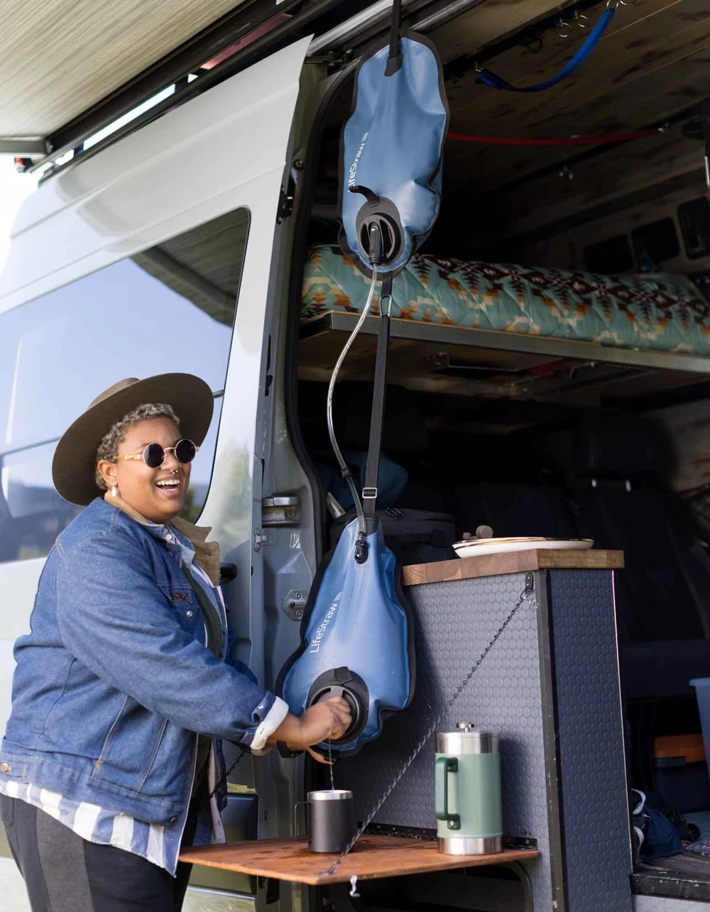 - Great for large groups, basecamp, and RV or van travel – easy to hang from a tree or RV for quick hydration