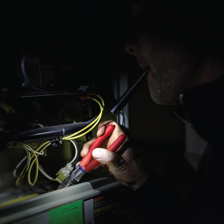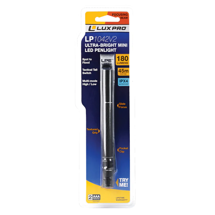 The LUXPRO penlight 180 lumen LED flashlight with a pocket clip is extremely lightweight and compact. This flashlight features a tactical on/off button to select between high and low mode. The output range on high is 180 lumens and on low is 60 lumens. It has a run time of 35 minutes on high and 1 hour on low. This flashlight is made durable with aircraft-grade aluminum and comes equipped with a quality pocket clip so you can attach it to your tool bag or pocket. It conveniently runs on and includes 2 AAA batteries.