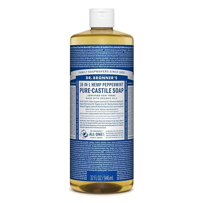 Dr. Bronner’s 18-in-1 Pure-Castile Soaps are multi-surface all-purpose cleaners good for just about any task. Wash body, hair, hands! Clean toilets, bathtubs, countertops, dishes-great for laundry, mopping, pets, and aromatherapy-with no synthetic preservatives, detergents or foaming agents—none! Dilute! Dilute! OK!! Do not use this scent with children under three years old, as the tingle from the peppermint can be overwhelming for them.