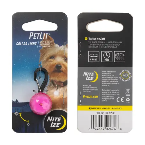 The PetLit LED Collar Light is a unique battery-powered LED that you can clip securely to your pet's collar, keeping him or her stylish and visible at all hours of the day and night. Made of durable plastic with a jewel crystal decoration, the bright LED light is easy to activate with a simple twist. It's a fun, yet reliable way to keep your furry friend safe and visible when you're out hiking, camping, running, walking, or playing in the park - and all other early morning or late evening romps.