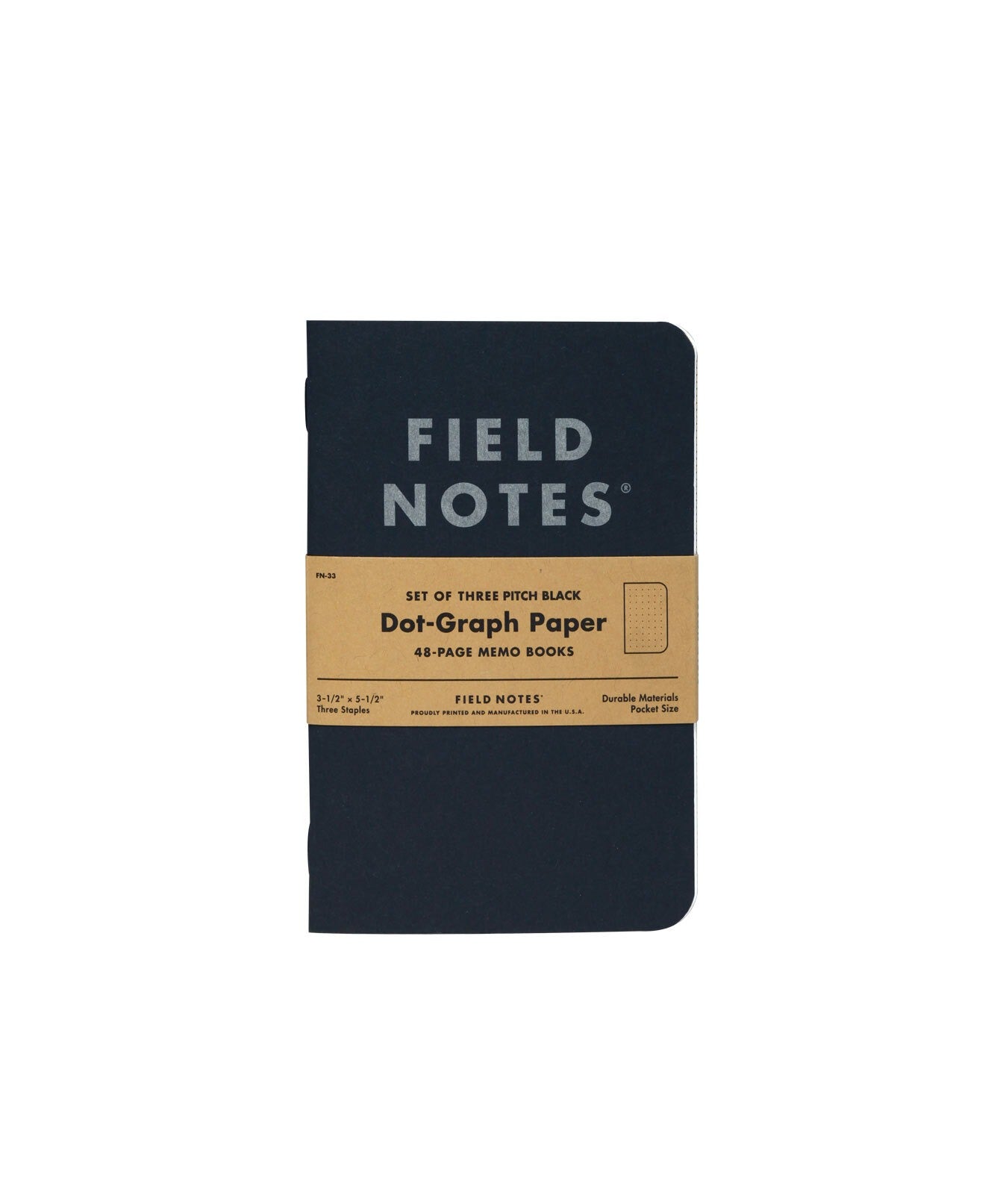 The Field Note classic 3-1/2" × 5-1/2" Pitch Black memo books, now available in a 3-Pack with 60# Finch Opaque body paper in Dot-Graph or Ruled styles. They're bound with glossy black staples and sturdy 118# covers featuring a Field Notes-exclusive black/kraft duplex paper from French Paper Co.