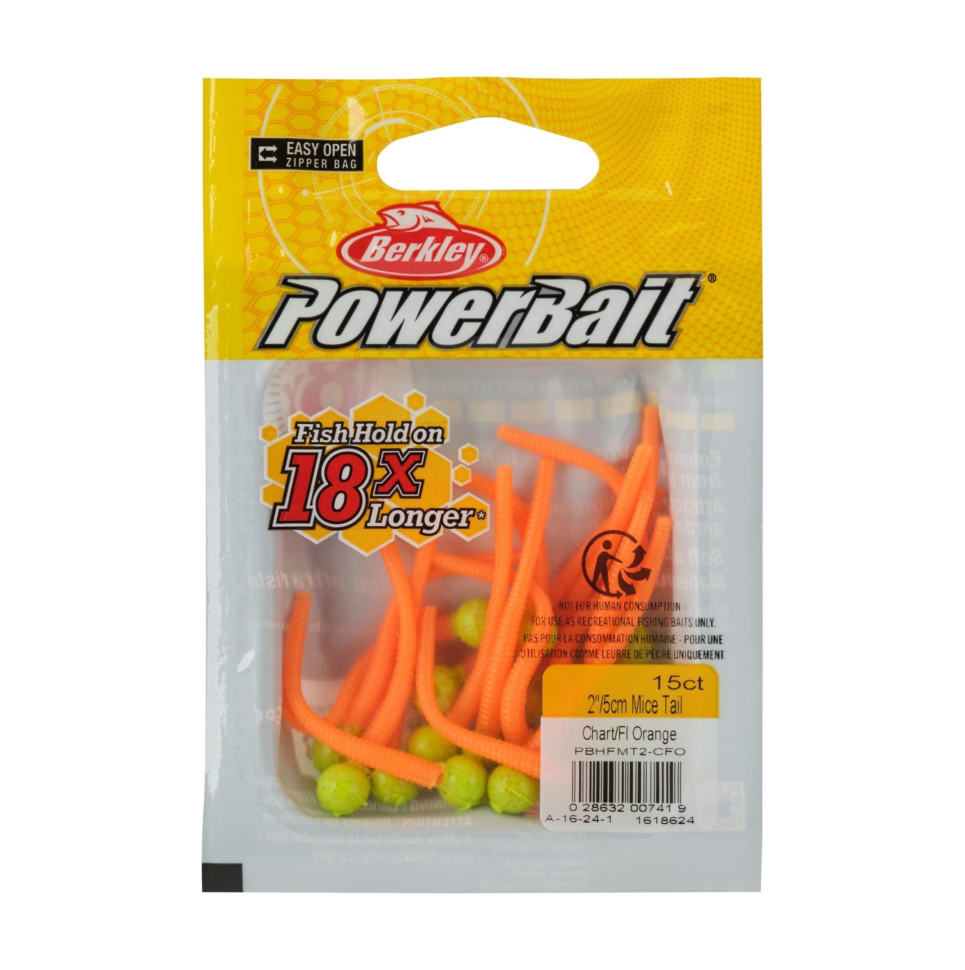 The Berkley 2" PowerBait Floating Mice Tails feature a combination of salmon egg and trout worm to create one incredible bait. The unique shape replicates "Power Mouse" rig for trout. The different head and tail colors provide maximum contrast in the water column while the lively action gives a lifelike presentation. Berkley PowerBait makes novice anglers good, and good anglers great! Berkley scientists have spent over 30 years perfecting an irresistible scent and flavor - the exclusive PowerBait formula. Fish love PowerBait so much - it entices the most wary fish and gets them to hold on 18 times longer, which gives you the time and confidence to Feel More Bites, Set More Hooks, and Catch More Fish!