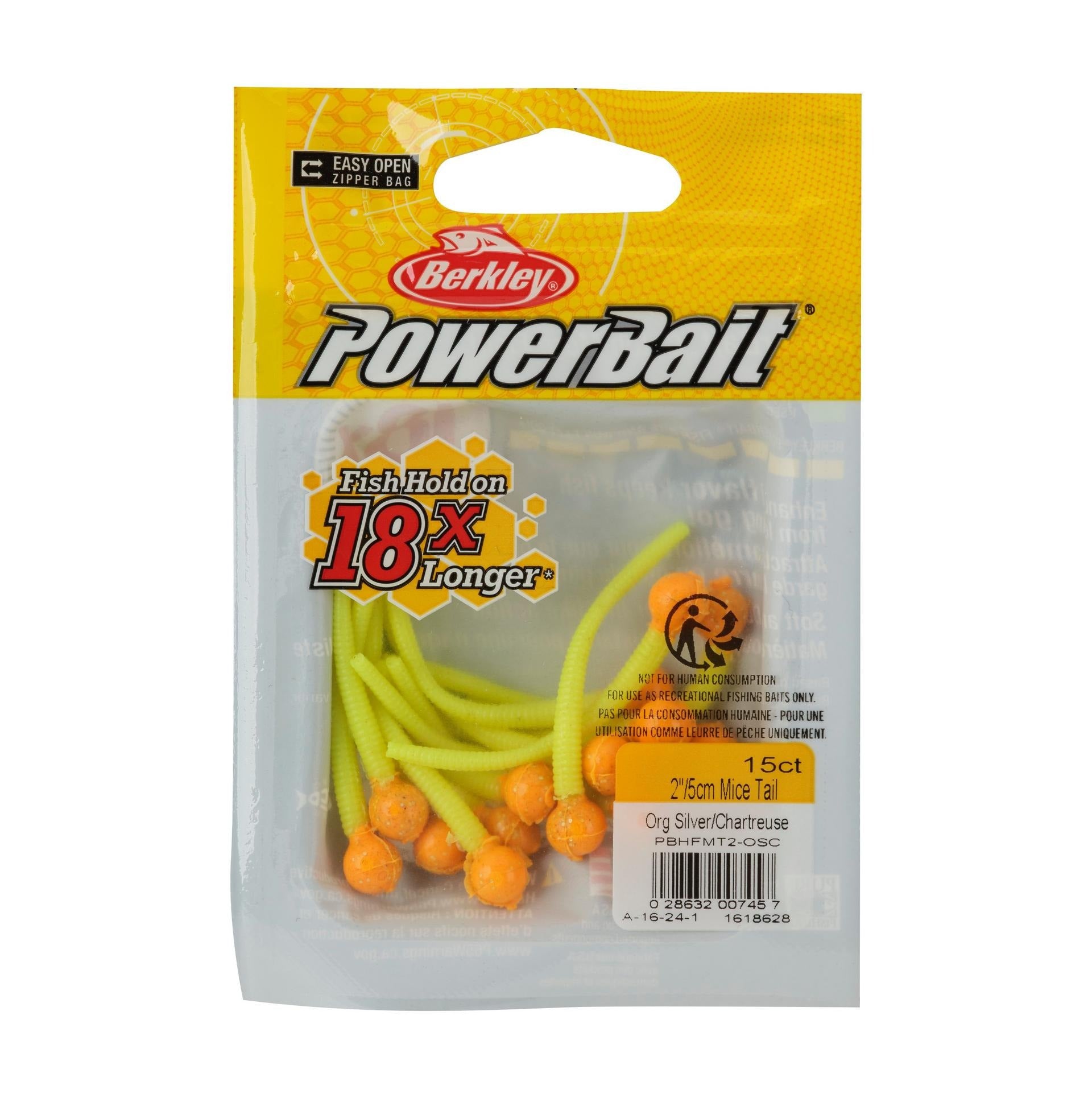 The Berkley 2" PowerBait Floating Mice Tails feature a combination of salmon egg and trout worm to create one incredible bait. The unique shape replicates "Power Mouse" rig for trout. The different head and tail colors provide maximum contrast in the water column while the lively action gives a lifelike presentation. Berkley PowerBait makes novice anglers good, and good anglers great! Berkley scientists have spent over 30 years perfecting an irresistible scent and flavor - the exclusive PowerBait formula. Fish love PowerBait so much - it entices the most wary fish and gets them to hold on 18 times longer, which gives you the time and confidence to Feel More Bites, Set More Hooks, and Catch More Fish!
