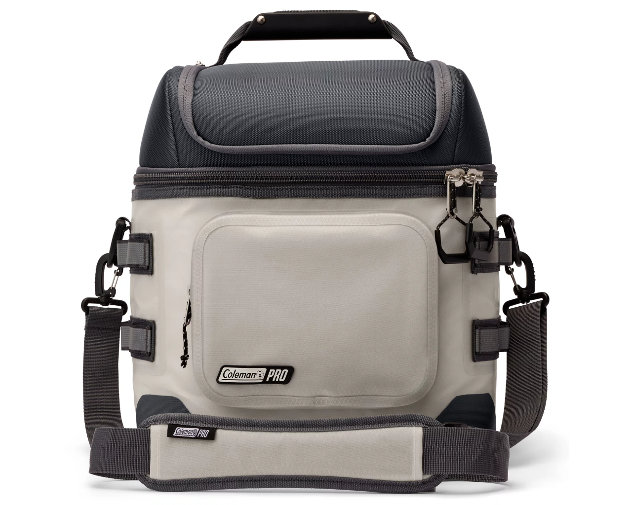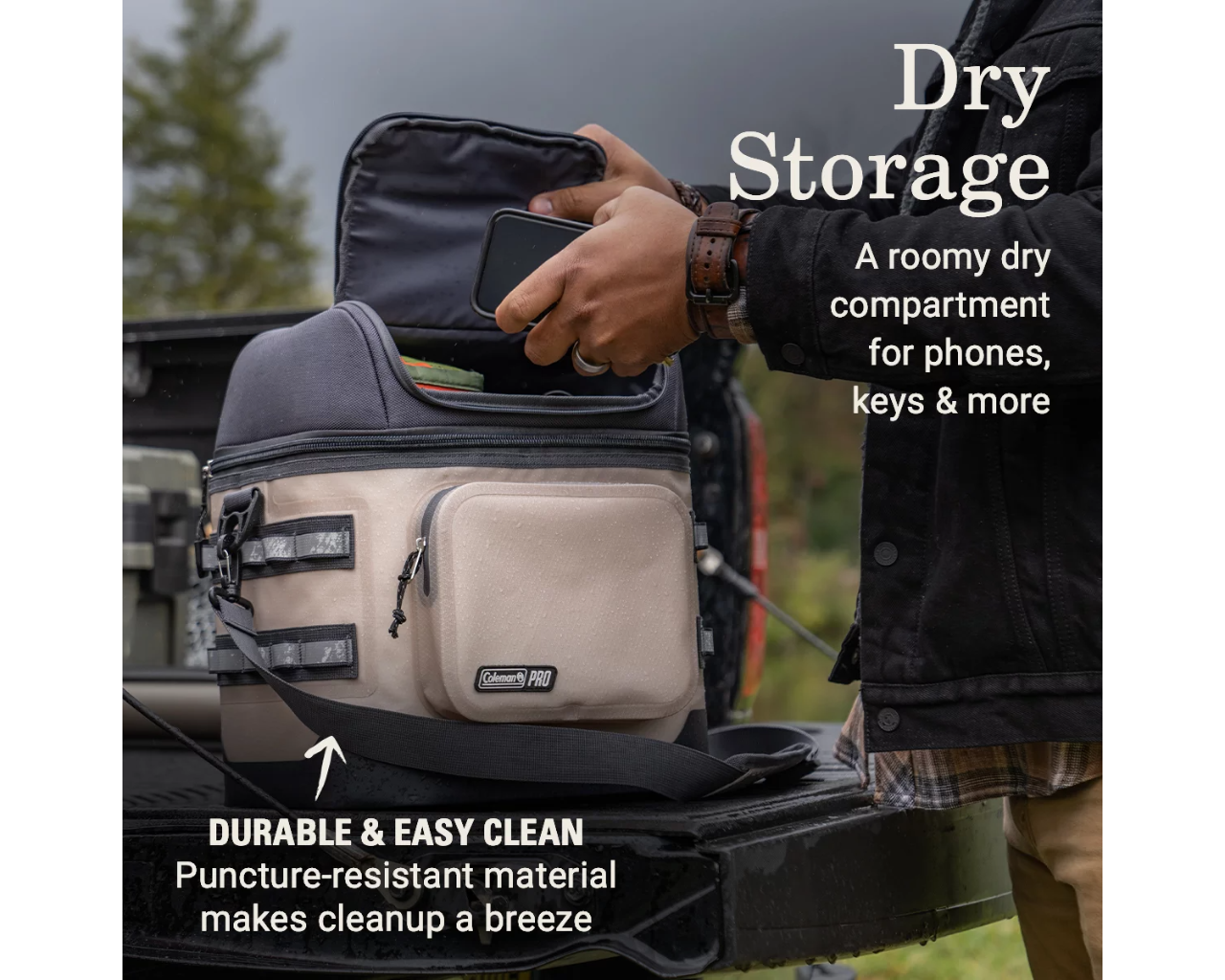 Coleman Pro is gear that works hard like you. It is purpose-built for everyday use in the most demanding environments. The Coleman Pro 24-Can Soft Cooler will keep your lunch and drinks for the crew cold all day. A separate dry storage compartment is a handy spot to store keys, phones, and more. Built tough, the durable exterior is puncture resistant and backed by a 3-year limited warranty. The antimicrobial treatment to the interior helps protect it from odor causing bacteria while a compression molded base protects the soft cooler to help prevent leaks. Throw the Coleman soft cooler over your shoulder to keep your hands free to carry toolboxes or fishing gear. Work smarter, not harder with oversized zipper pulls for easy access in work gloves and reflective molle webbing for extra storage. ***Antimicrobial properties are built in to protect the product from odor causing bacteria. The product does not protect users or others from disease causing bacteria. Always clean this product thoroughly after each use.