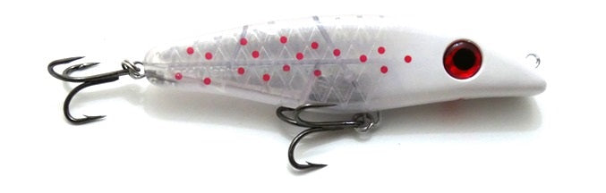 The Quibble is a super versatile bait. Because of it's unique shape it shares the characteristics of a glide bait, a jerk bait and even a darter style bait. The angle of the face will plane it down. The rounded soft transition to the sides of the bait help it wonder and glide. The flat sides and weighting help the bait glide. If you slowly reel in this bait it will randomly wiggle and wonder like a darter. If you reel a bit faster the bait will wiggle to you like a lip bait. If you long pull it this bait will dive and dart. When you stop reeling the bait will hold its position or slowly float up depending on the salinity of the water you are fishing. The flat sides help prevent this bait from rolling over when fished aggressively or when fished in strong currents.